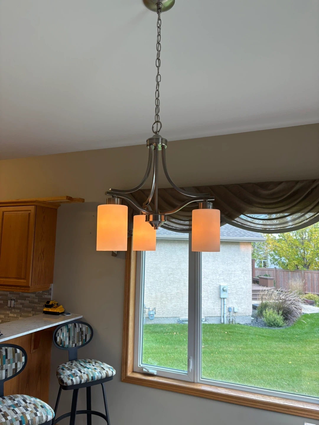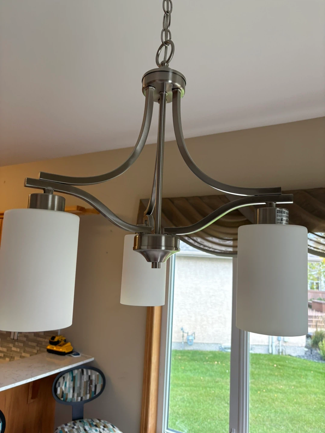 Selling a stylish three-light chandelier with a brushed nickel finish. It's in great shape and would be a lovely addition to any dining room or kitchen! The shades are a soft, warm white, providing a cozy ambiance