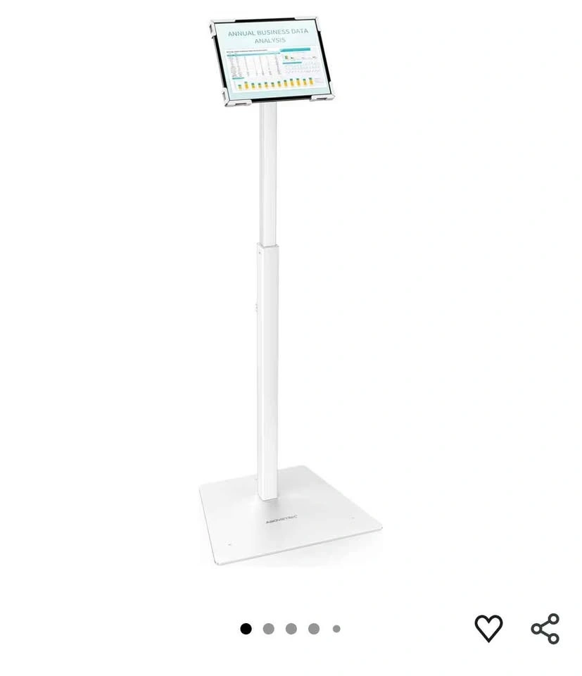 Sturdy ABOVETEC tablet floor stand in white. Heavy-duty steel build with adjustable height from 29.5" to 45.3". Fits tablets 9.7" to 13" and up to 0.4" thick. Features a stable 5.3 lbs base and locks securely with an adjustable knob.