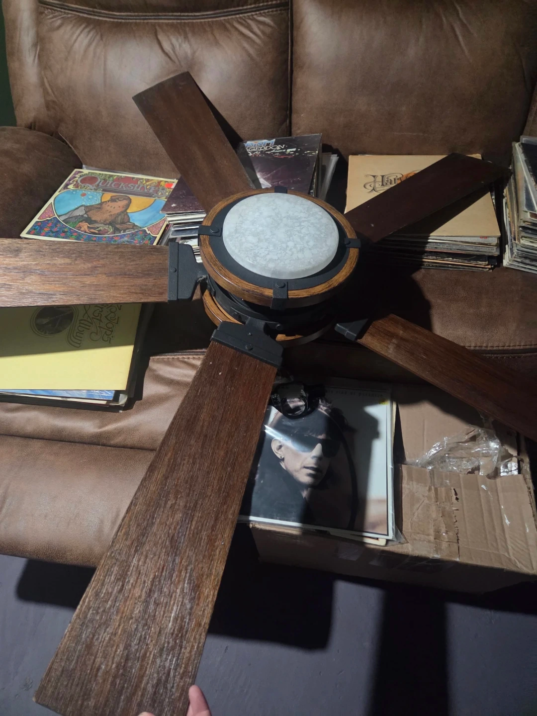 This is a wooden blade ceiling fan with a central light fixture. The blades have a dark wood finish and are approximately 21.5 inches long from the center. Comes with remote.