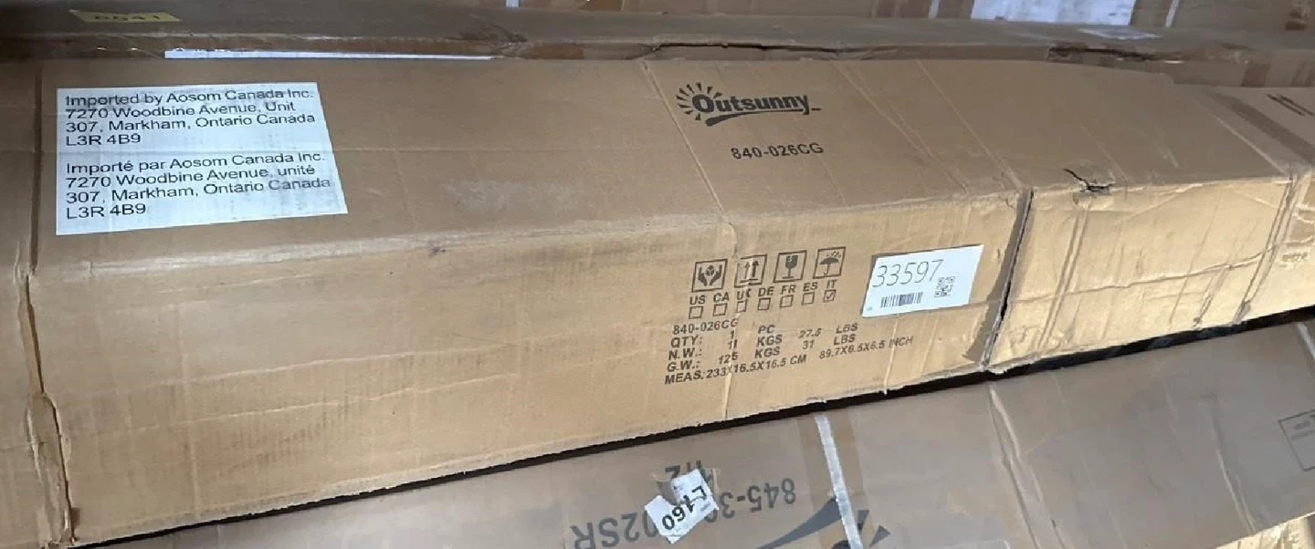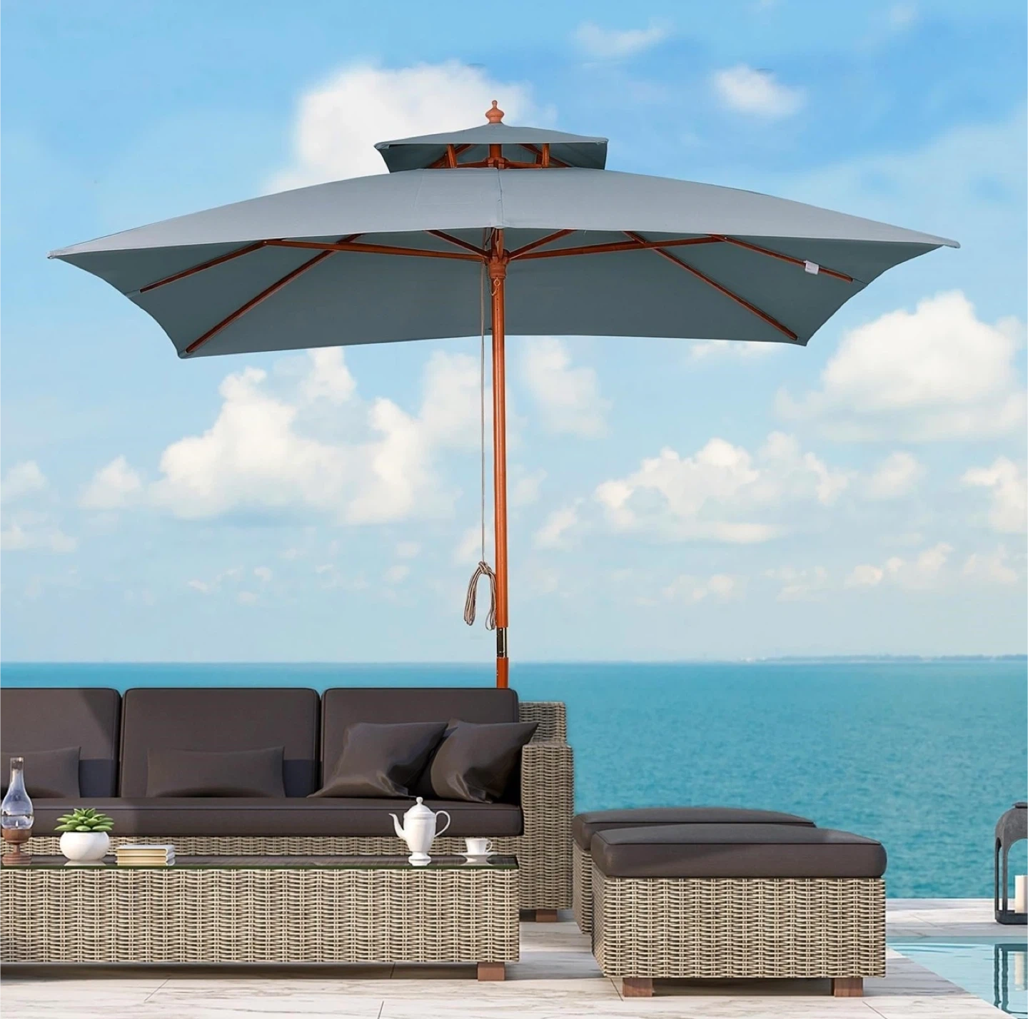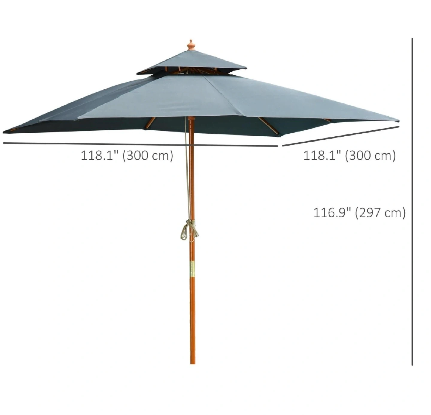 This Outsunny patio umbrella offers ample shade. It's a double-tier umbrella with a wooden pole and grey canopy. Dimensions are 118.1" x 118.1" x 116.9".