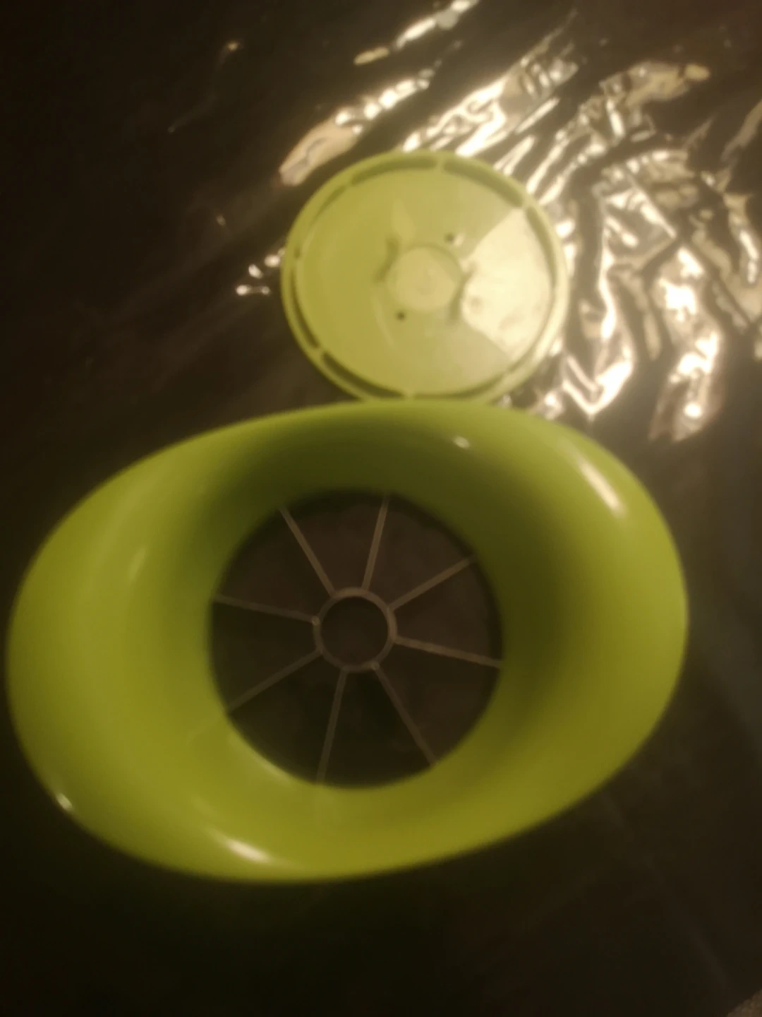 This apple slicer has comfortable handles. It's made of green plastic and has metal blades. The lid (blade protector) is included.🍎🍏