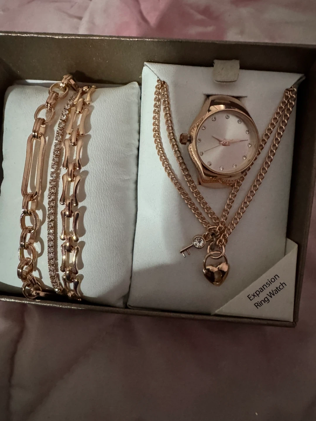 Selling a beautiful rose gold jewelry set! It includes a watch, a bracelet, and a necklace. The set comes in its original box, making it perfect for gifting or treating yourself or a beloved one.