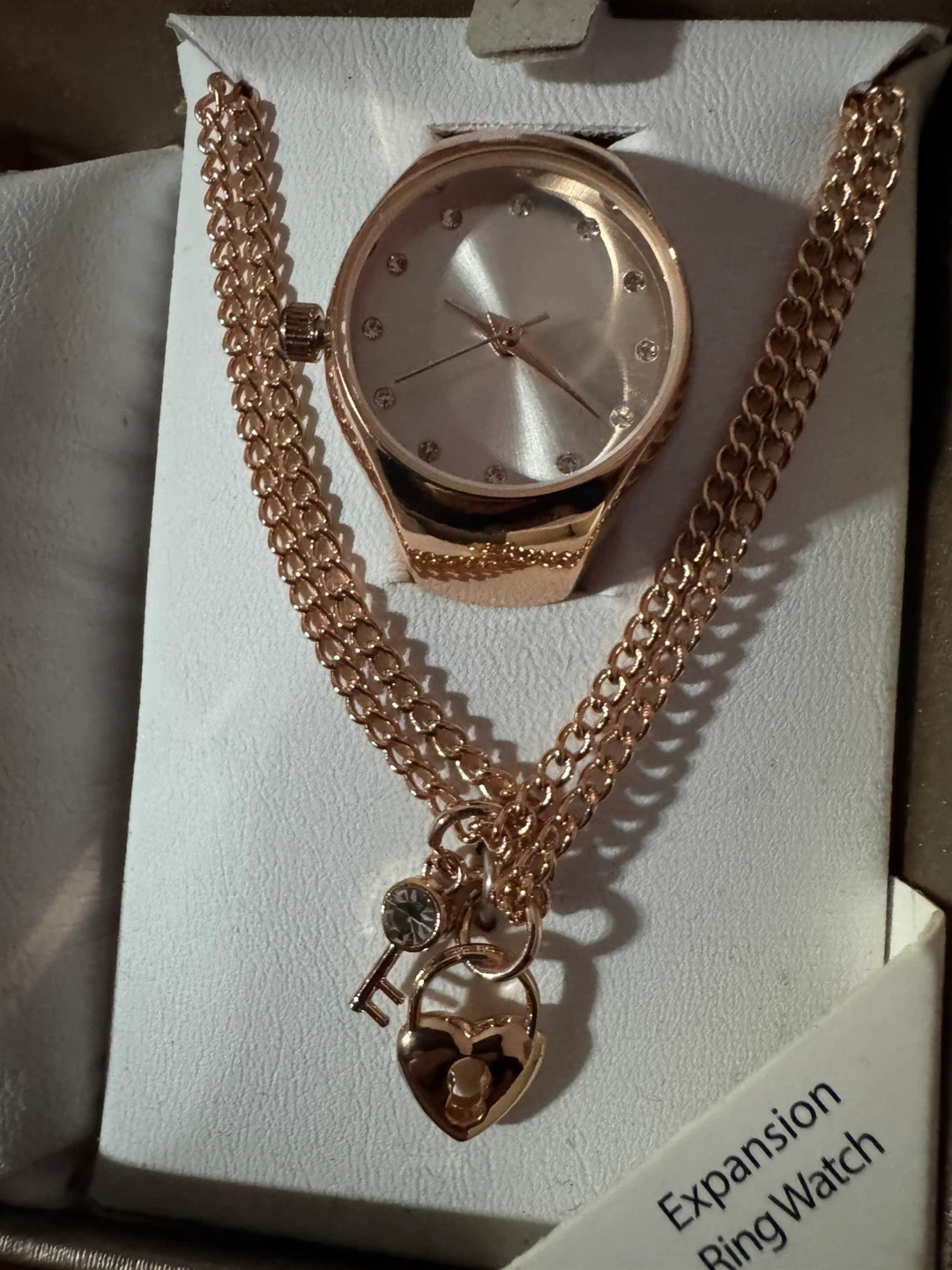 Selling a beautiful rose gold jewelry set! It includes a watch, a bracelet, and a necklace. The set comes in its original box, making it perfect for gifting or treating yourself or a beloved one.