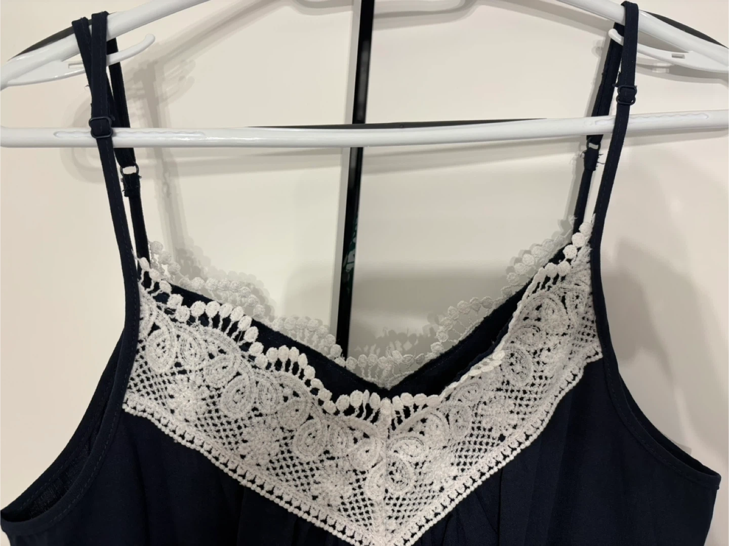 Cute navy blue romper with adjustable straps! It's perfect for summer or wearing around the house. It's in great condition and ready for a new home. Worn twice and selling because it no longer fits. No size tag but purchased a small.