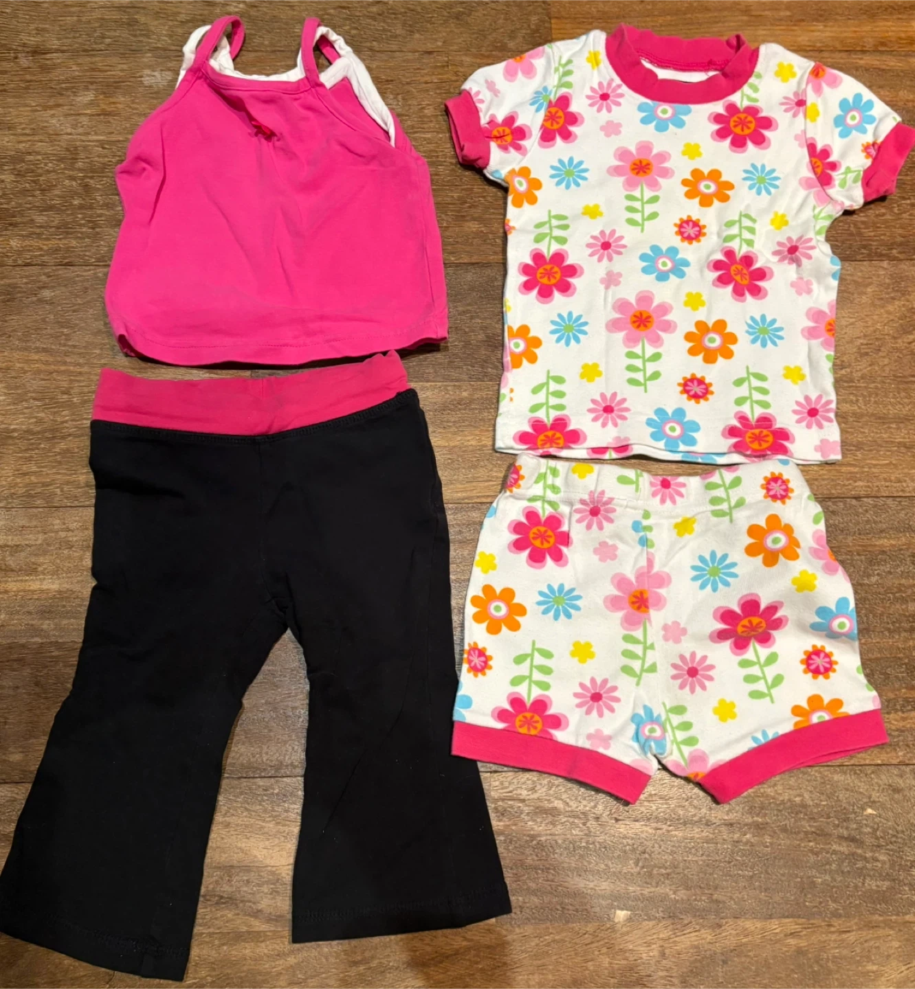This cute outfit set includes a pink tank top and black capri pants, along with a white t-shirt and floral shorts. It's perfect for warm weather play or casual outings.