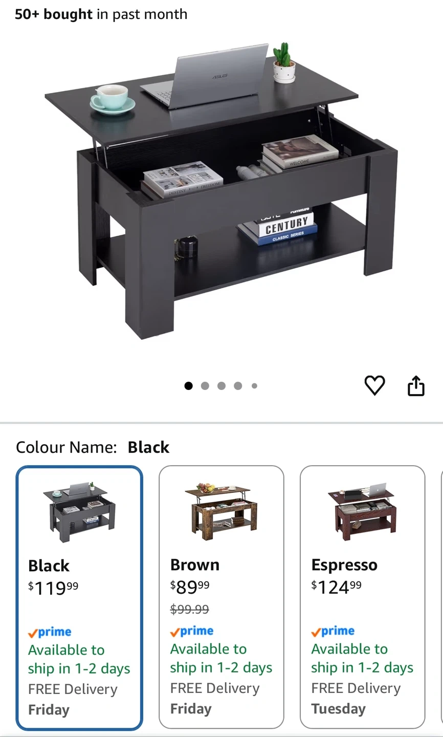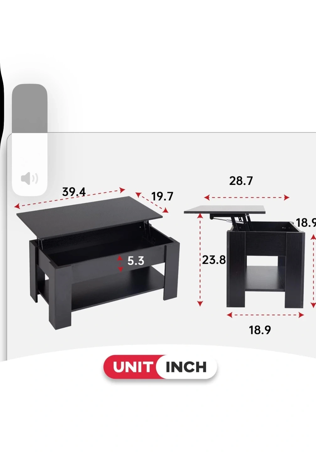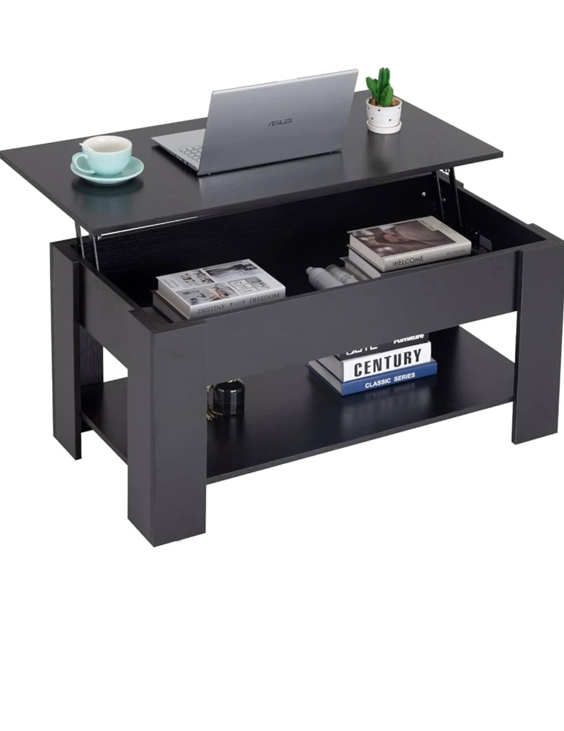 Black lift top coffee table with hidden storage compartment. Lower shelf provides additional space. Made of wood composite. Overall dimensions 39.4" L x 19.7" W x 23.8" H.