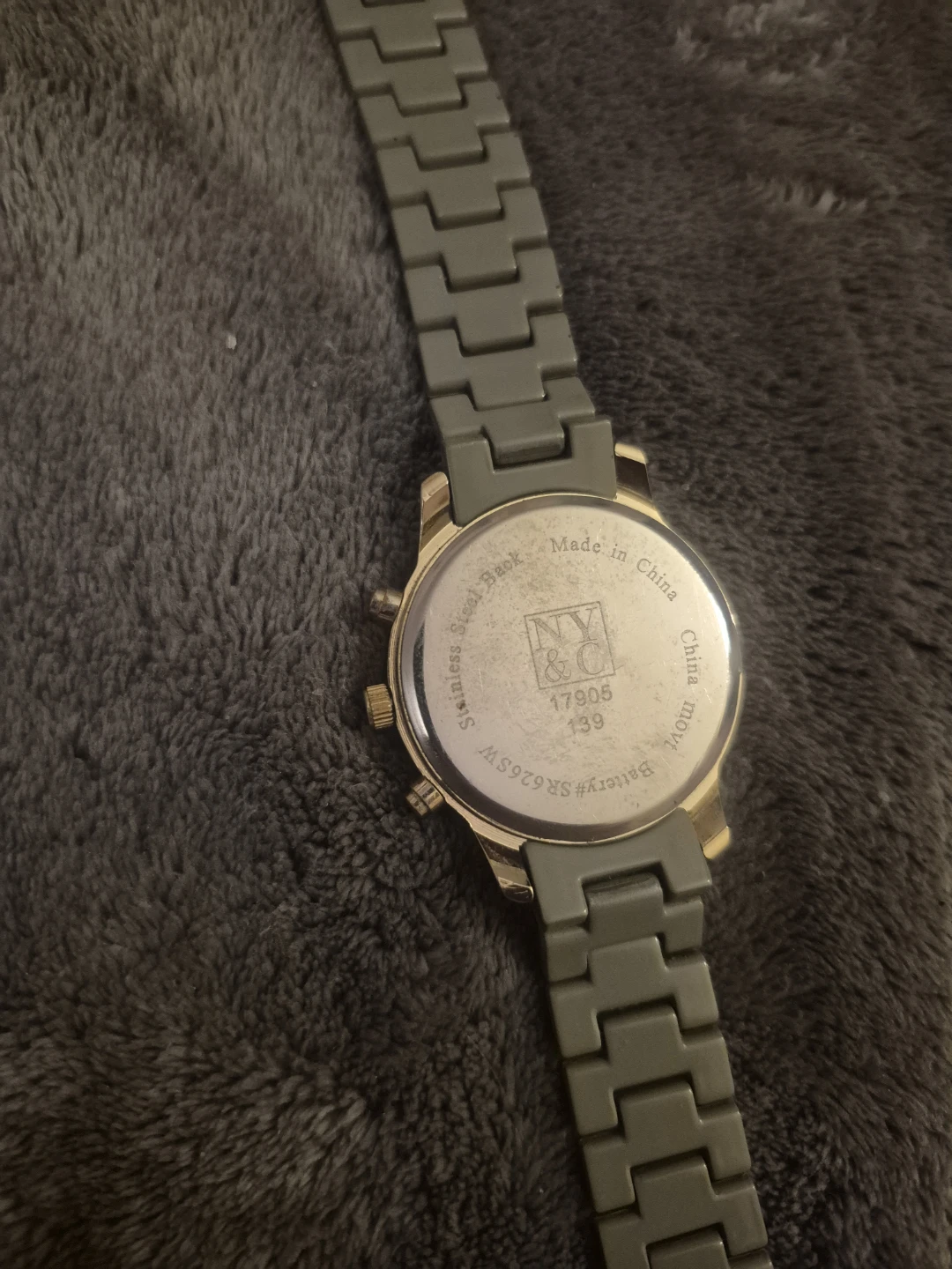 Here's a gray wristwatch from NY&C! It has a stainless steel back and a battery #SR626SW.