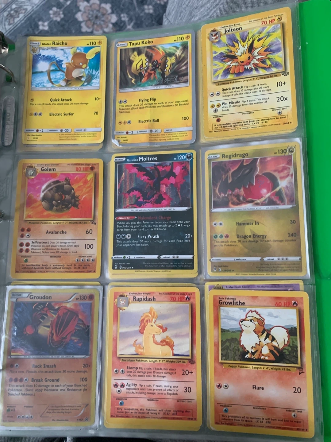 Collection of various Pokémon trading cards. Includes Pokémon like Alakazam, Golem, Charizard, Blastoise, Palkia, and more. Cards are from different sets and generations.