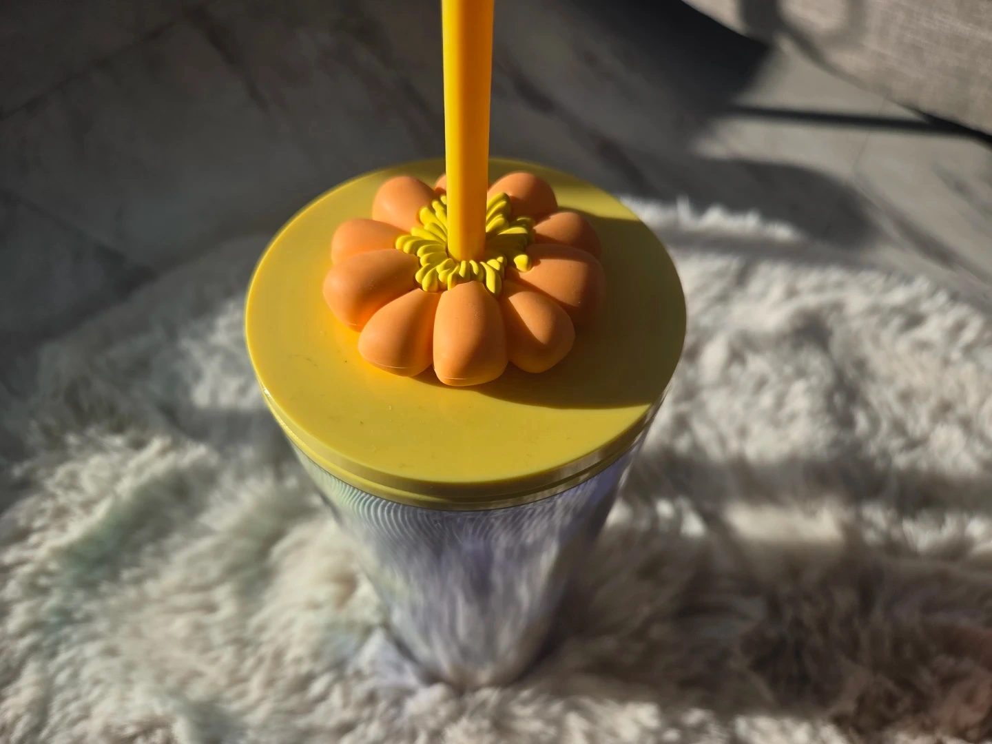 This tumbler features a colourful rainbow design with a yellow lid. It comes with a matching yellow straw and a fun flower accent on the lid. Great for staying hydrated on the go!