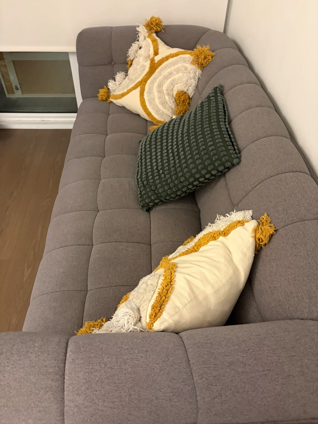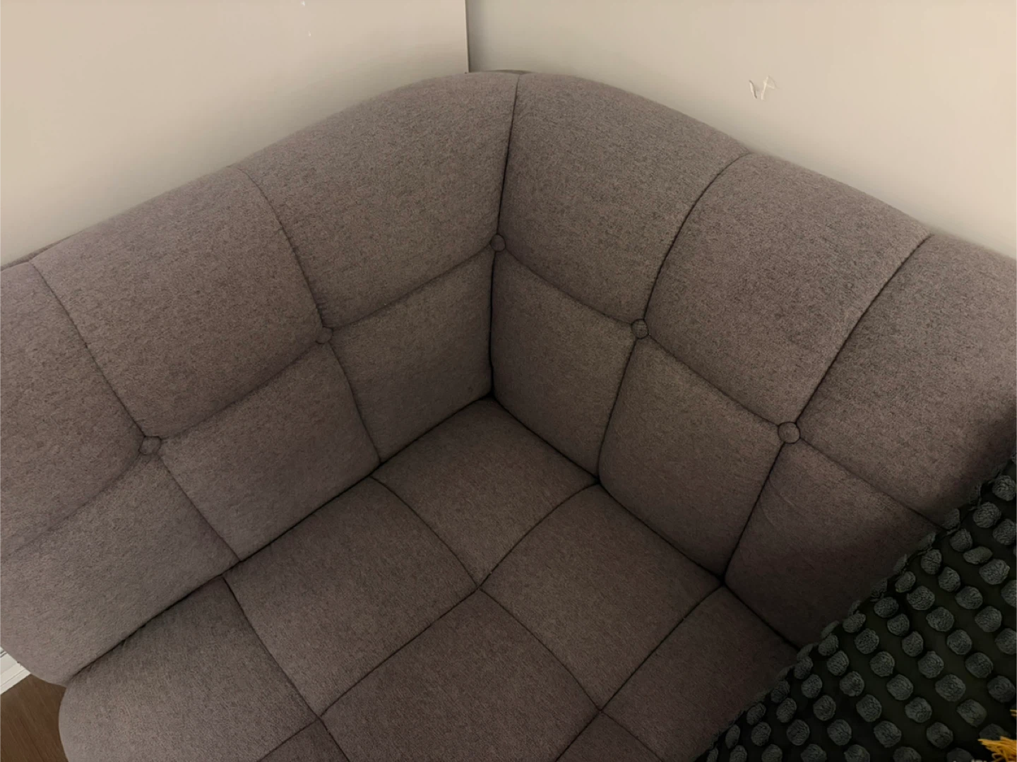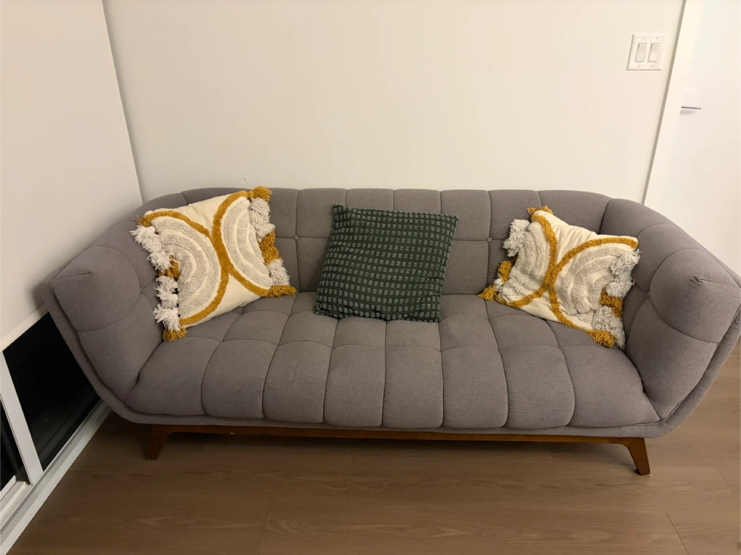 Selling a comfy grey sofa! It's in great shape and would be perfect for a living room or den. The cushions are soft and the fabric is durable. It's a stylish piece that can fit into any decor.