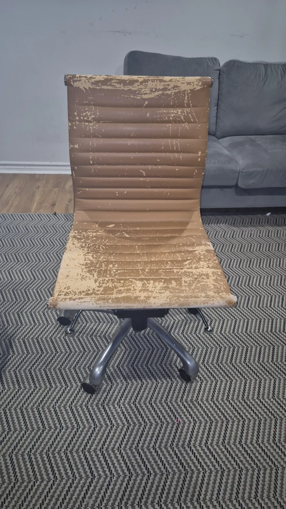 Selling an office chair. It shows significant wear and tear, as you can see in the photos. The material is peeling and there are visible scratches. Still functional, but definitely needs some TLC!