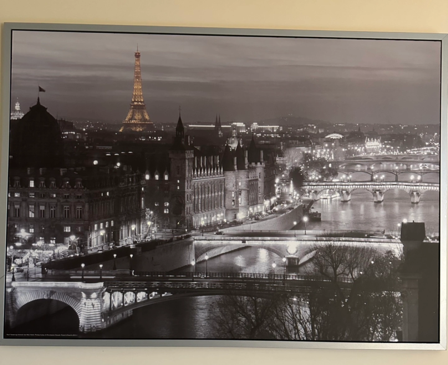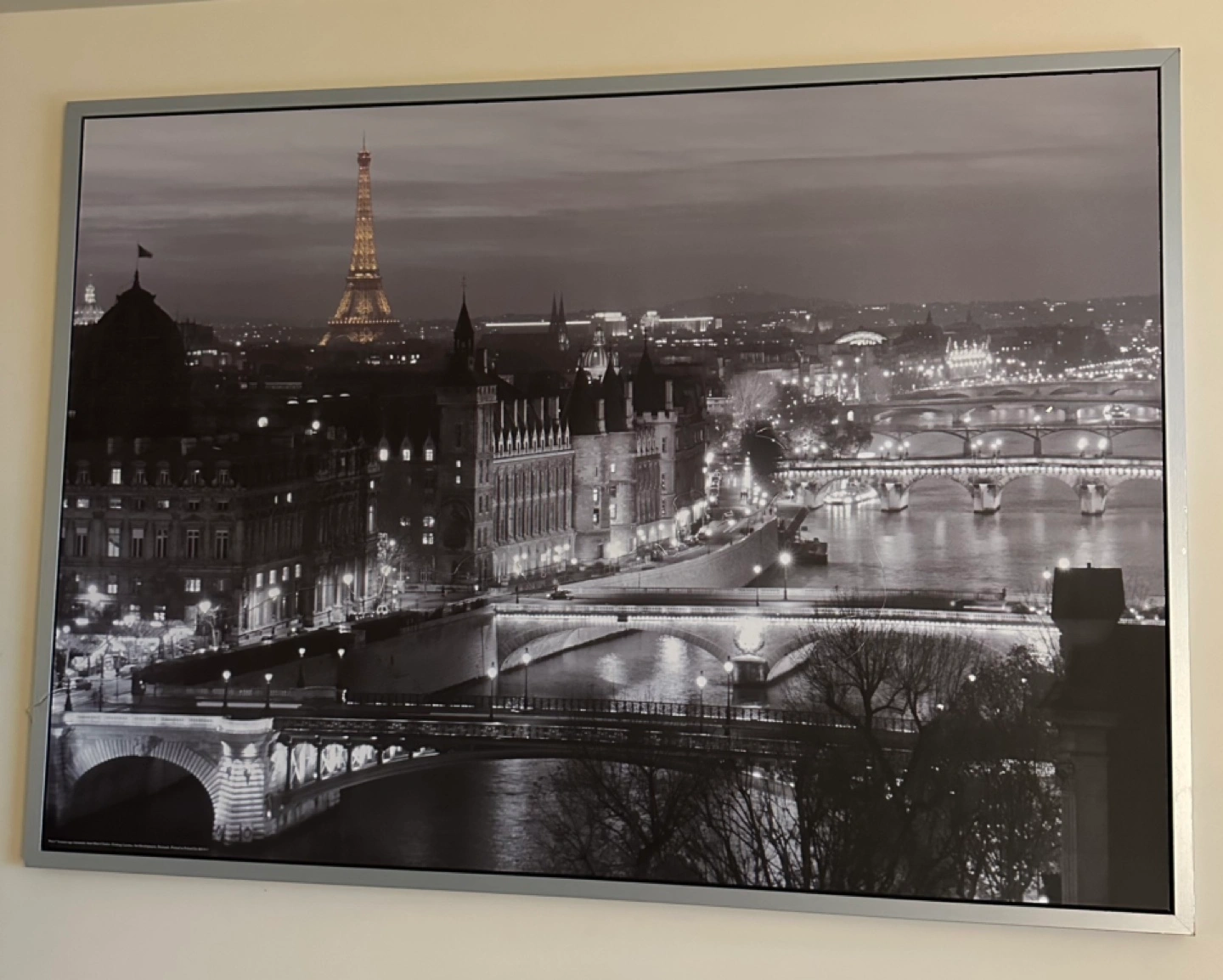 Large framed canvas print with lights. Sepia toned image of Paris at night. Eiffel Tower prominent. Silver frame. Great for home decor.
