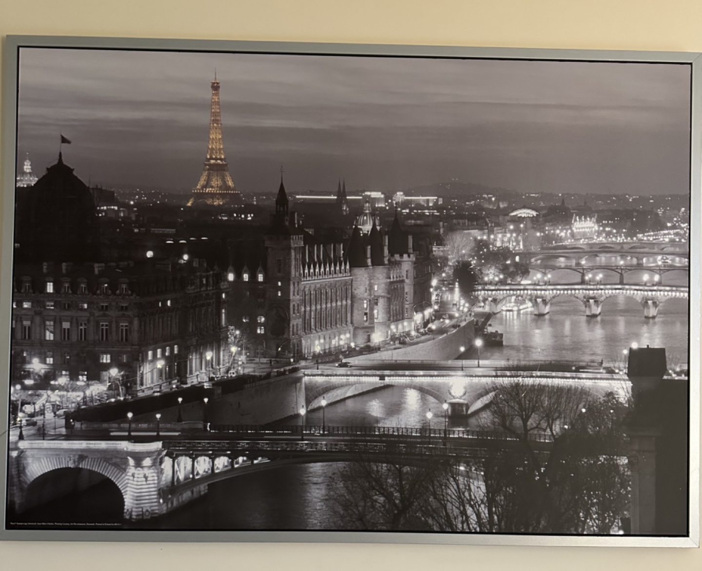 Large framed canvas print with lights. Sepia toned image of Paris at night. Eiffel Tower prominent. Silver frame. Great for home decor.