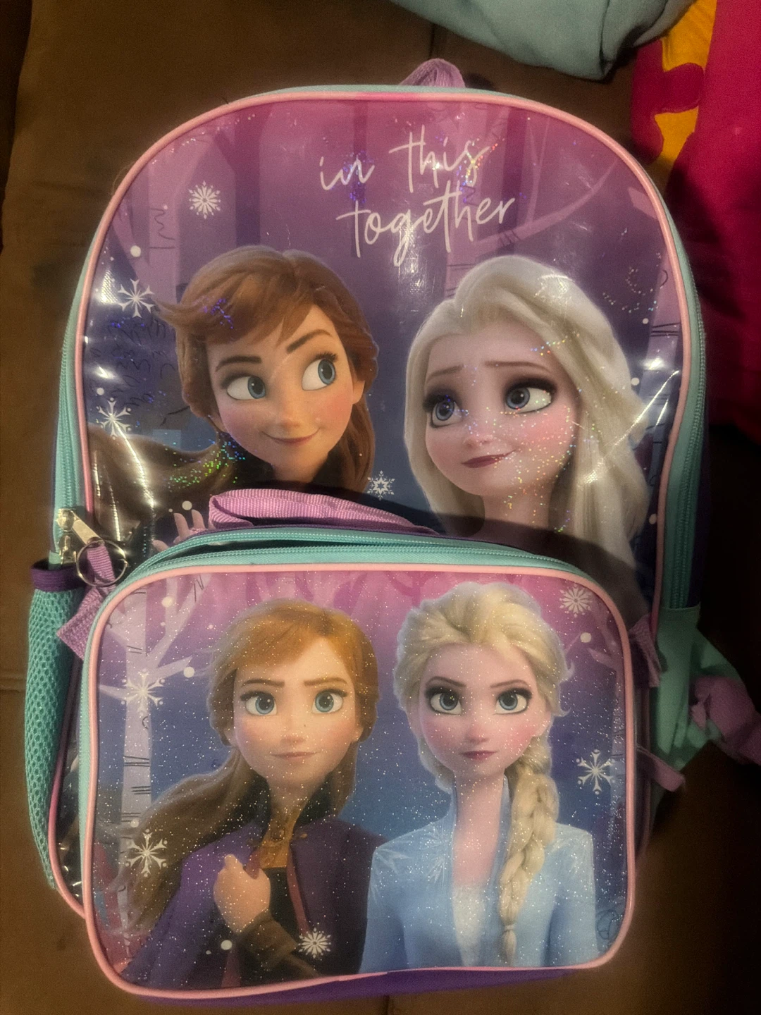 This Frozen backpack features Anna and Elsa with glitter accents. It's perfect for carrying school supplies or essentials for a day out. The backpack has adjustable straps for a comfortable fit. Comes with a lunch box.