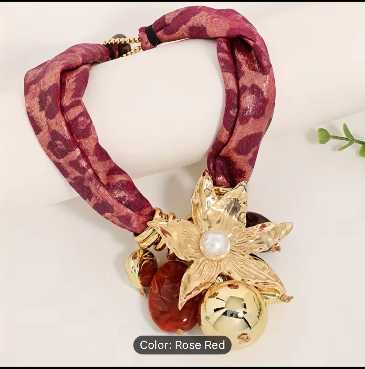 This is a beautiful statement necklace with a rose red and gold colour scheme. It features a floral design with a faux pearl centre and various beads and charms. It's perfect for adding a touch of elegance to any outfit!