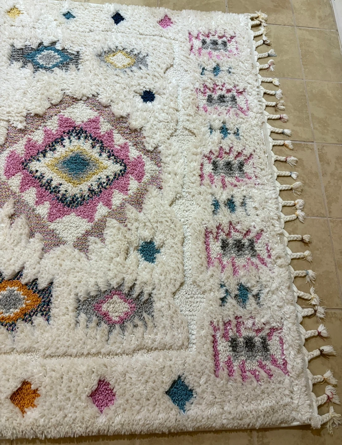 This is a beautiful area rug with a boho-inspired design! It features geometric patterns in shades of pink, blue, and yellow on an off-white background. The rug is finished with tassels along the edges, adding a touch of texture and charm.