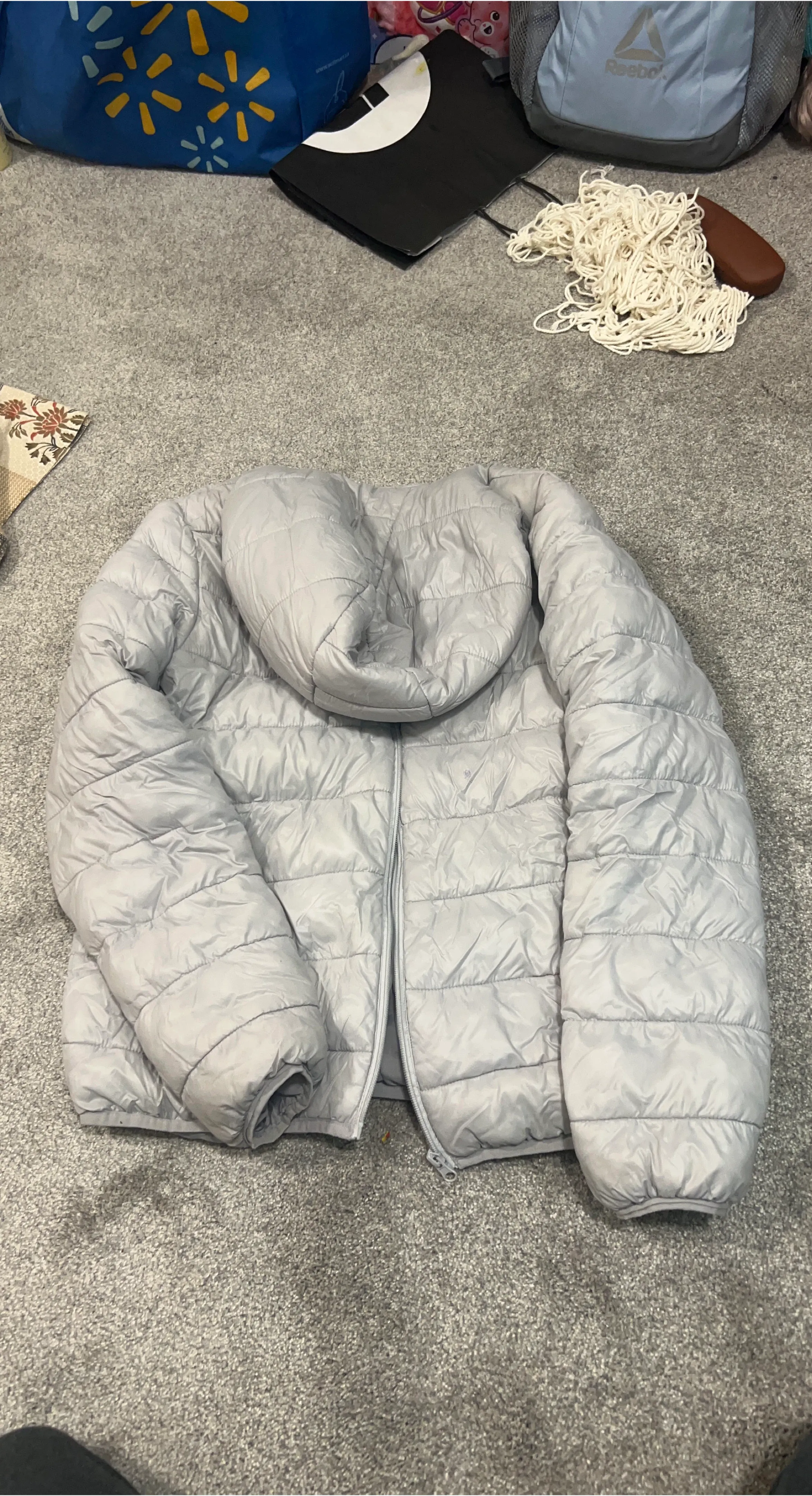 This lightweight puffer jacket is a comfortable and practical layering piece. It features a full zip closure and a hood for extra warmth. The neutral grey colour makes it easy to pair with any outfit.