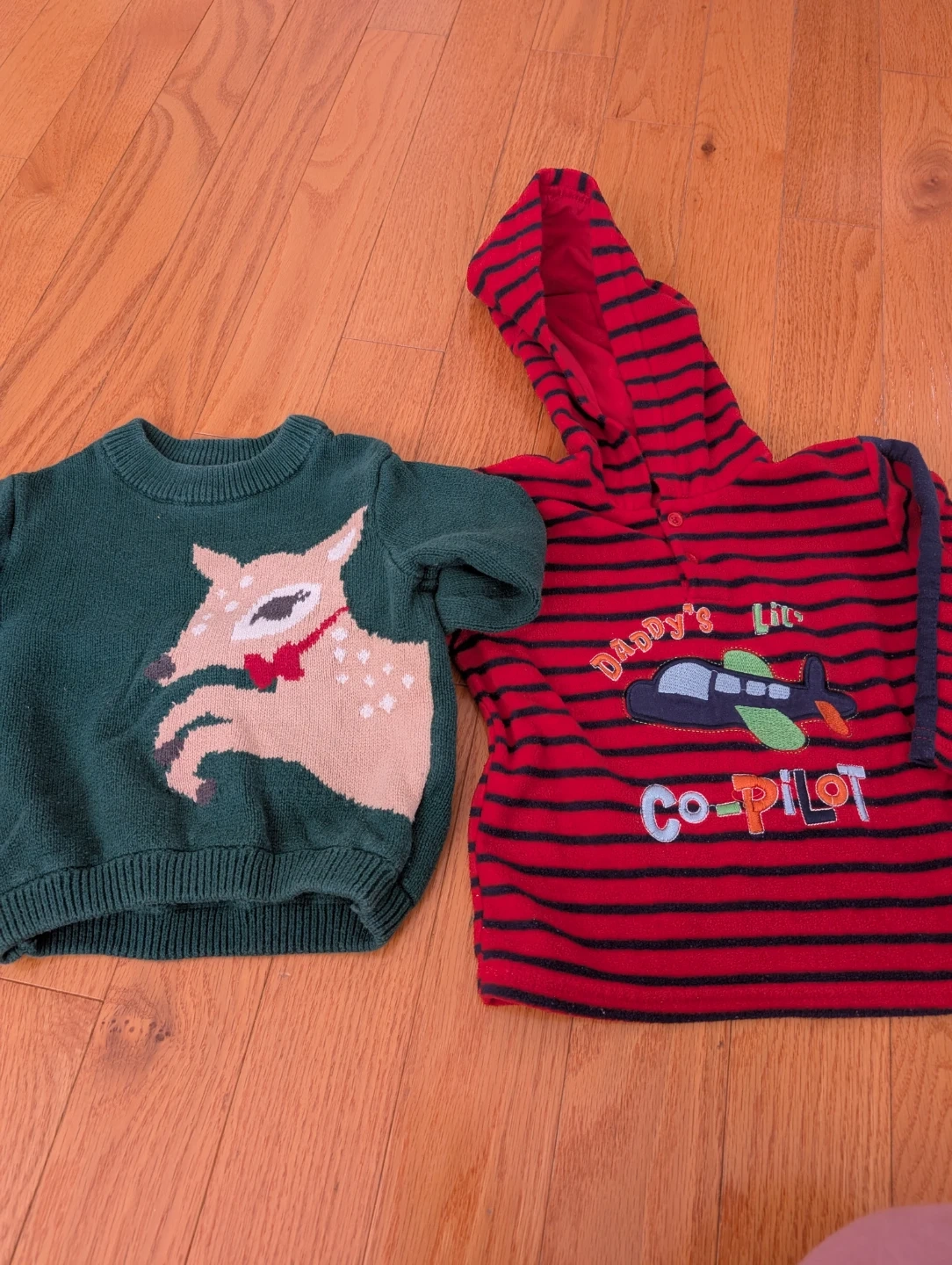 A bundle of boys' toddler clothes including sweaters, hoodies, and bodysuits. Features various fun designs like a deer, airplane, and Mickey Mouse. Some items are from Carter's. Selling as a bundle.