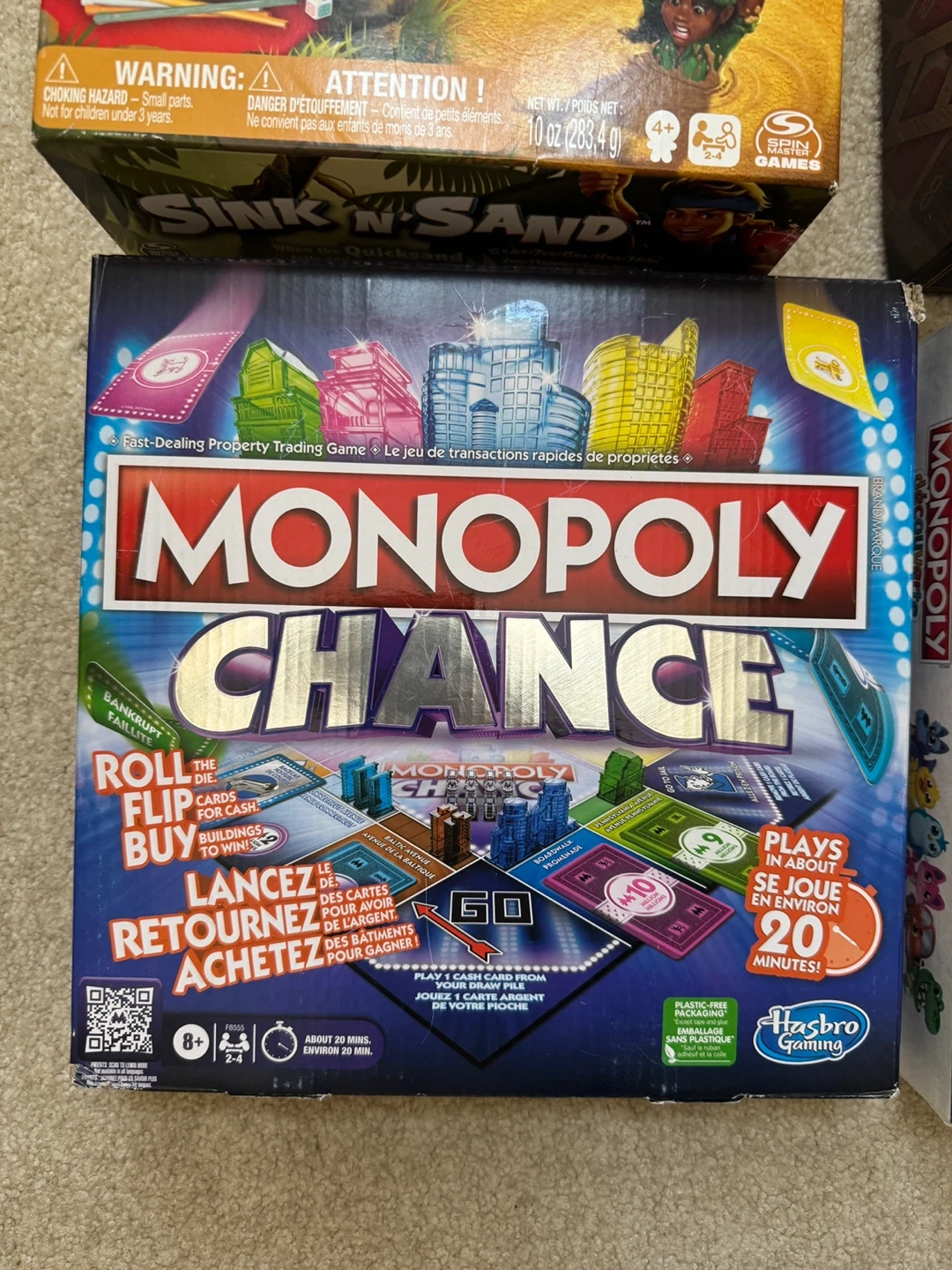 Selling a variety of board games, perfect for family fun! Includes classics like Monopoly Discover, Chutes and Ladders, Snakes and Ladders, Sink N' Sand, Protect the Penguin, Deluxe Loteria, Tumble Tower, Double Dominoes, Uno and Blue's Clues Matching Memory Game. All games are in good condition and ready for a new home!