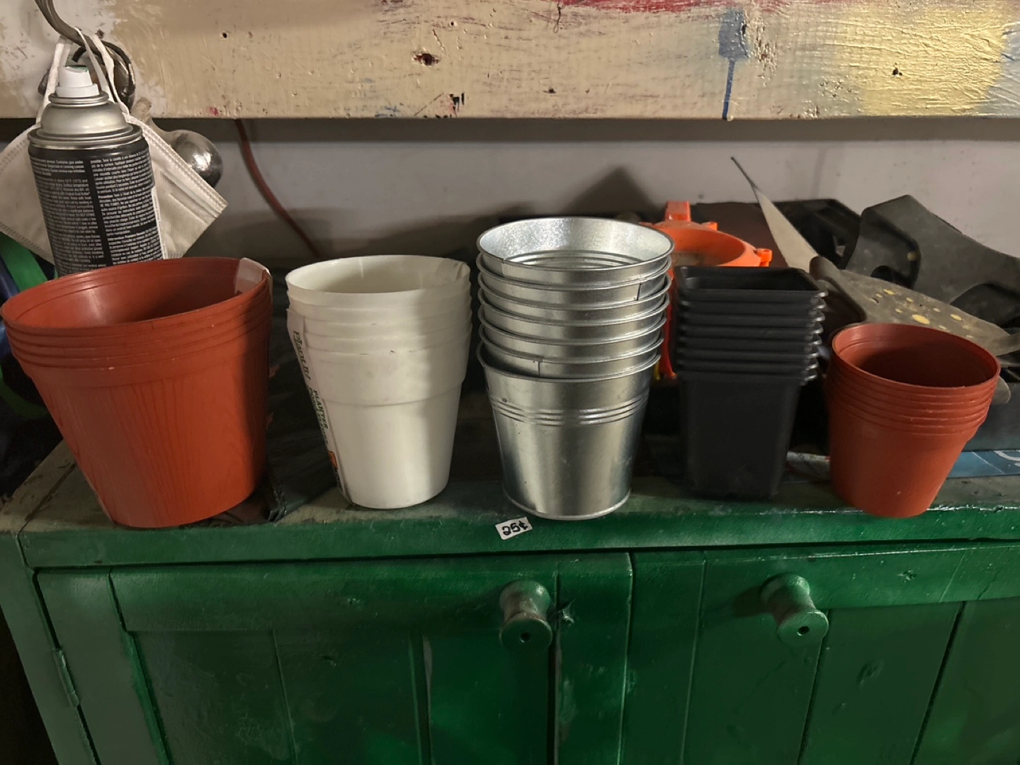 Assortment of small plant pots, great for starting seeds or propagating plants. Includes metal, plastic and terracotta.