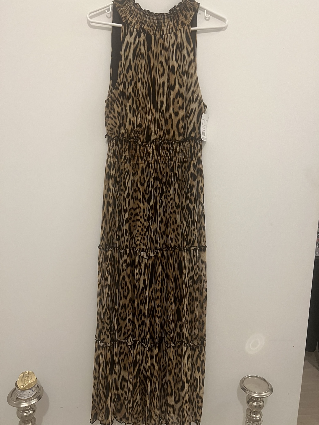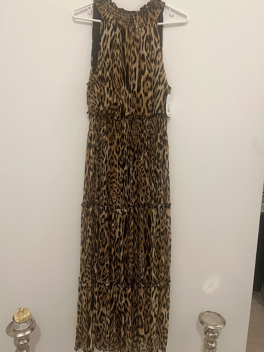 Stunning sleeveless maxi dress. Features a high neckline and tiered skirt. Leopard print. Perfect for any occasion.