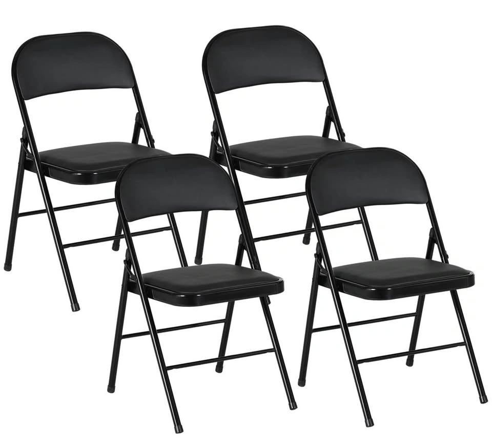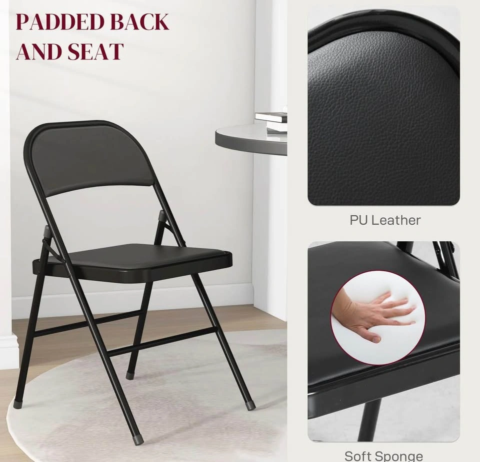 Brand new in box! Set of 4 metal foldable chairs with PU leather padded seats and open backs. Black color, suitable for indoor use.