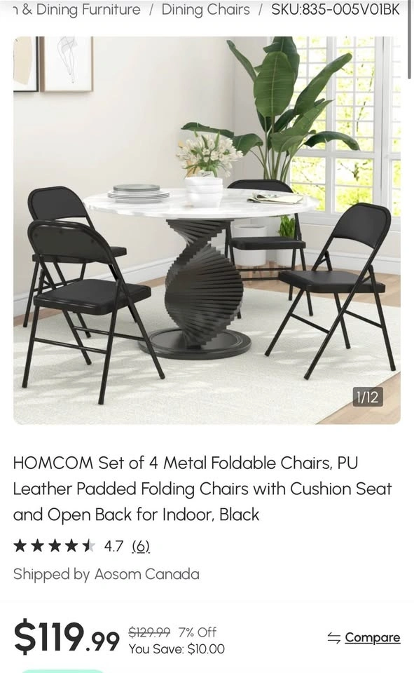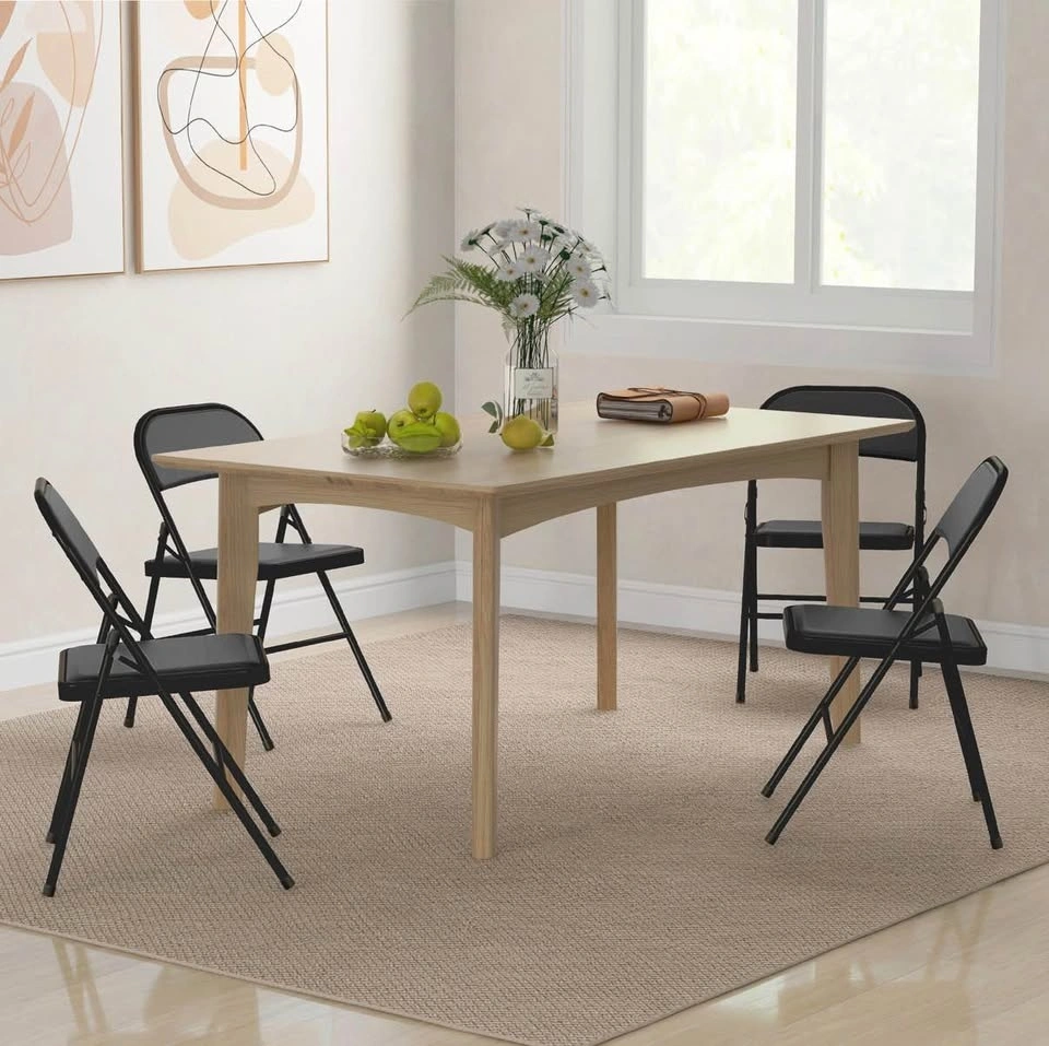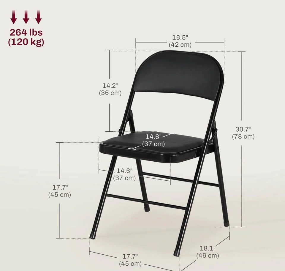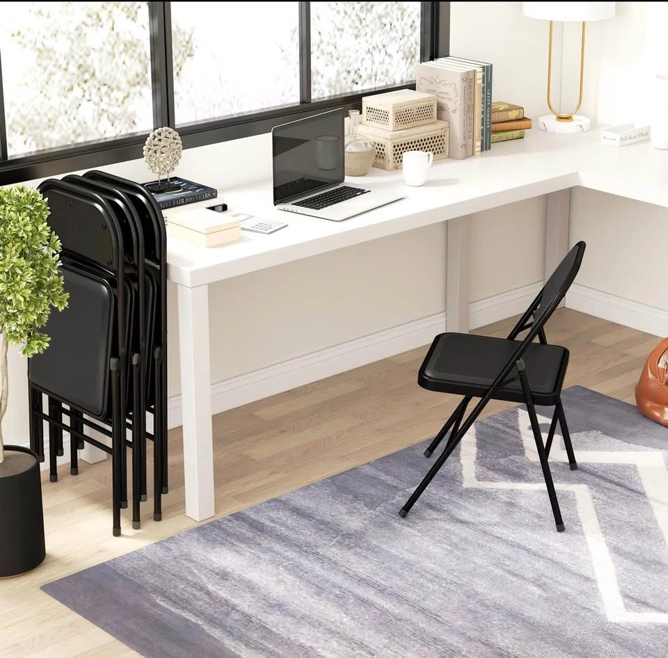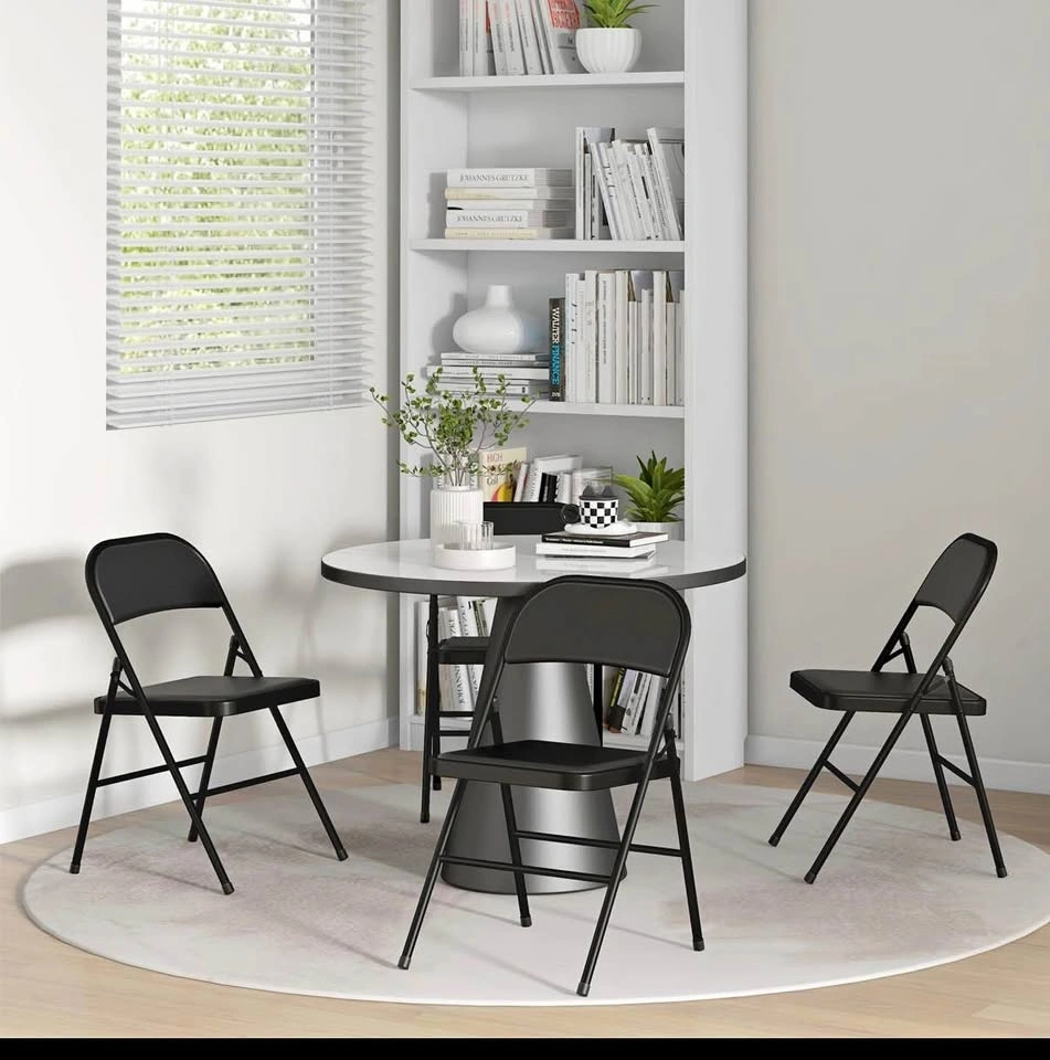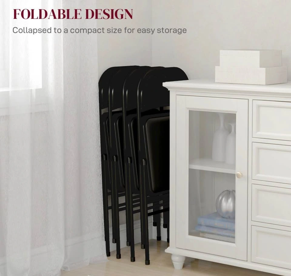 Brand new in box! Set of 4 metal foldable chairs with PU leather padded seats and open backs. Black color, suitable for indoor use.