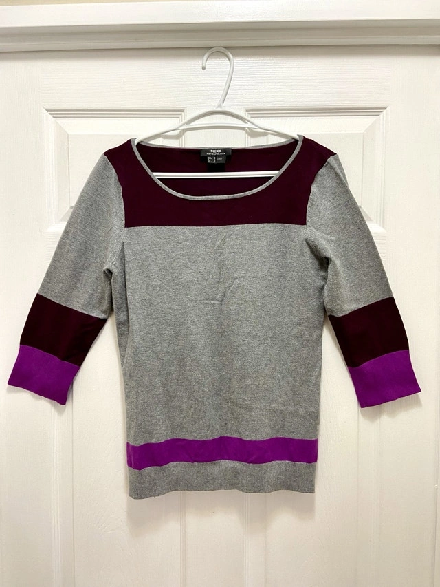 This is a Mexx sweater, perfect for adding a pop of colour to your wardrobe! The sweater is grey, with purple and burgundy stripes. Specifications: * Brand: Mexx * Size: M * Colour: Grey, purple, burgundy Looking to add some cozy flair to your closet? This Mexx sweater is just the ticket! Don't miss out – if the ad's up, it's still available! Priced accordingly. Local Pickup and cash only. Lowballers will be ignored.
