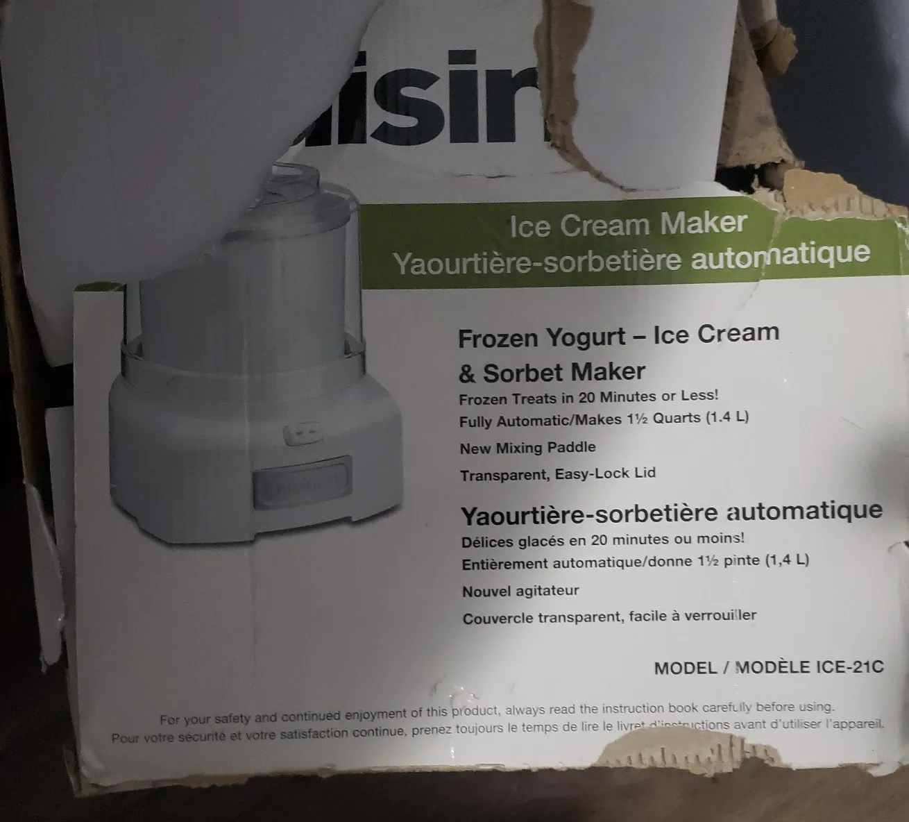 Get ready to make some delicious frozen treats with this Cuisinart Ice Cream & Sorbet Maker! It's fully automatic and can make frozen treats in just 20 minutes or less. It makes 1 1/2 quarts (1.4 L) and has a new mixing paddle and a transparent, easy-lock lid. The model number is ICE-21C