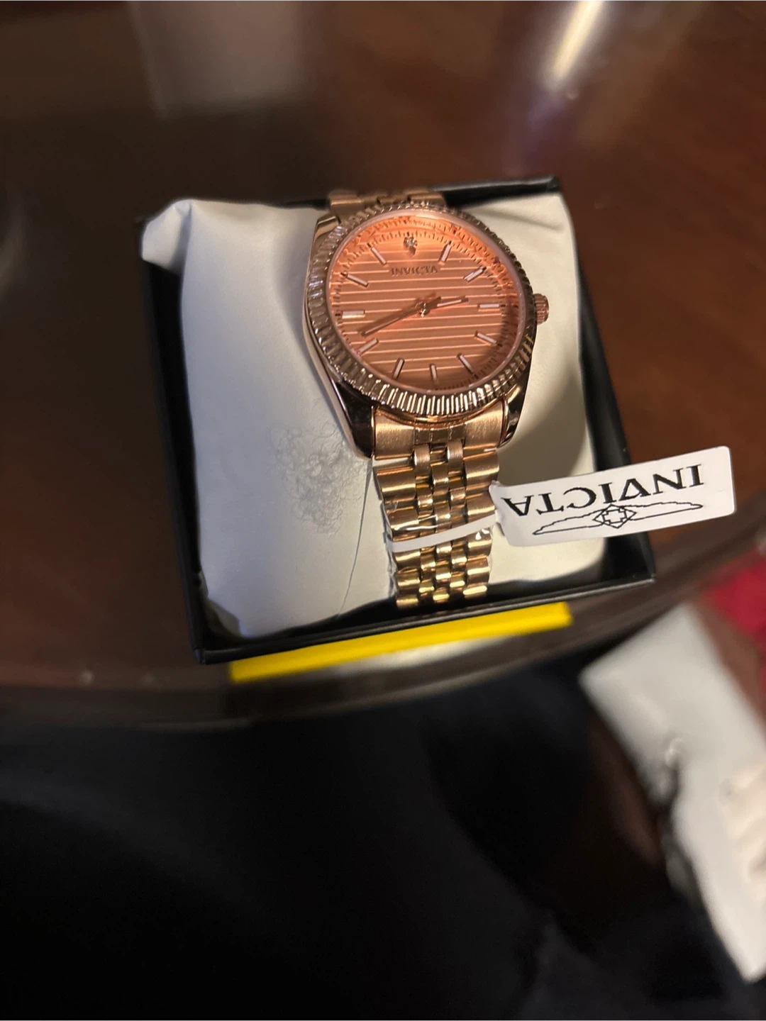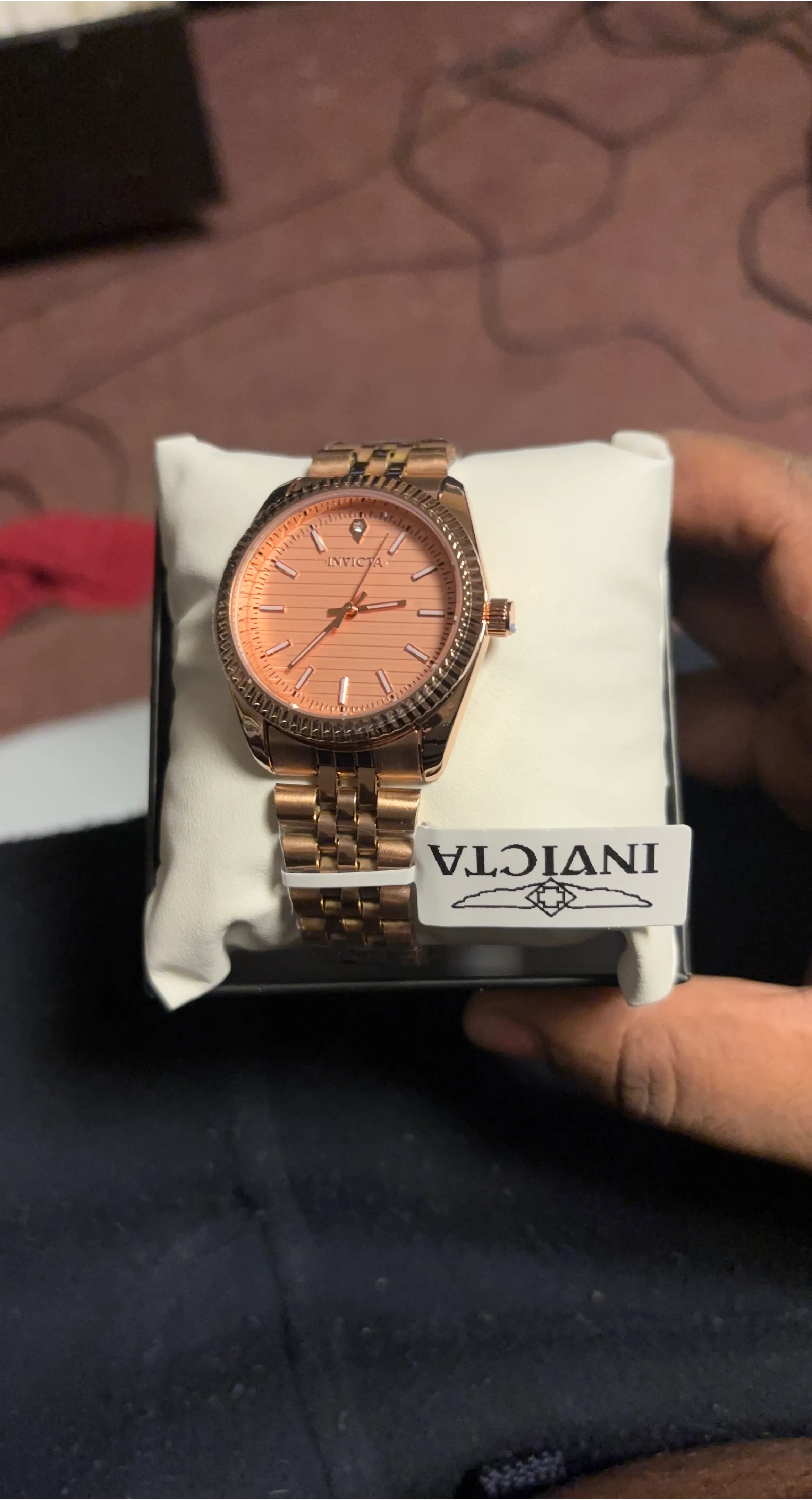 This is an Invicta watch with a rose gold tone metal band and a matching rose gold dial. It comes in its original box. The watch is in excellent condition.