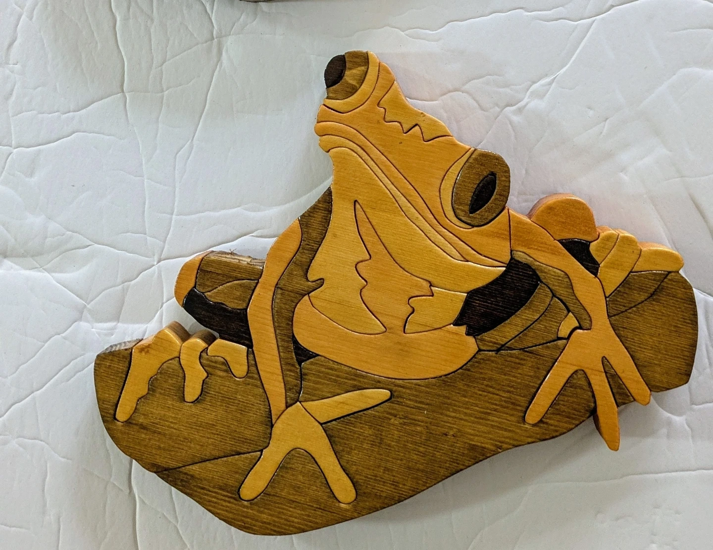 This is a wooden intarsia art piece featuring a frog. It's made of layered wood in various shades of brown and orange. The craftsmanship is detailed. Gloss finish, hardboard backer. 7 5/8" W x 7/8" D x 7 3/4" H