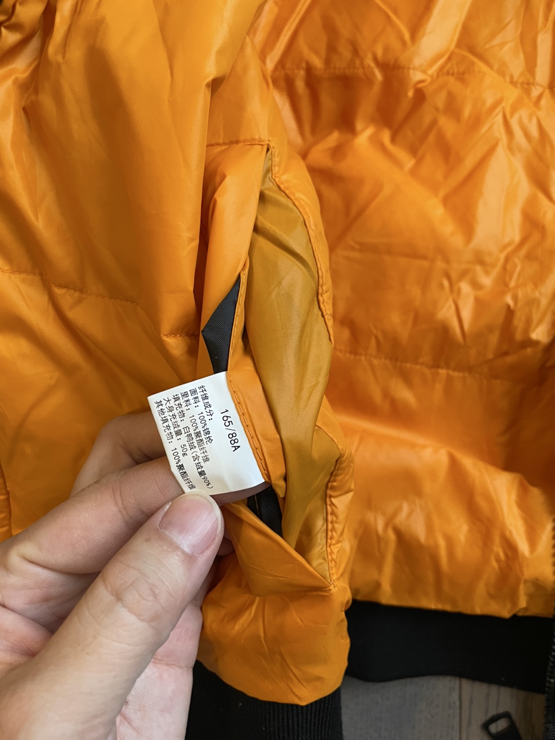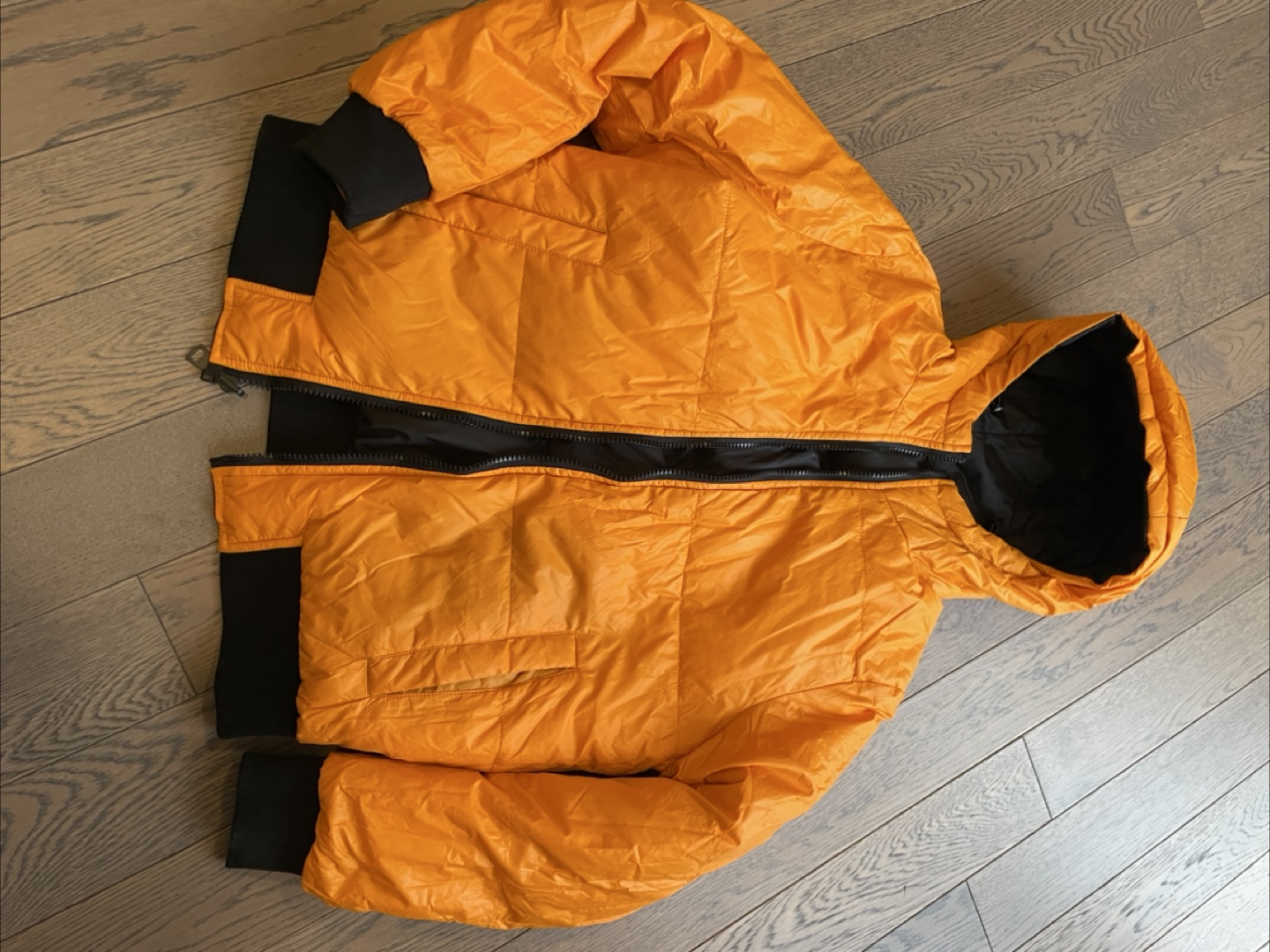 This reversible puffer jacket is black on one side with an orange lining. It features a hood and ribbed cuffs and hem. The filling is 100% polyester. This jacket is great for staying warm on cooler days!