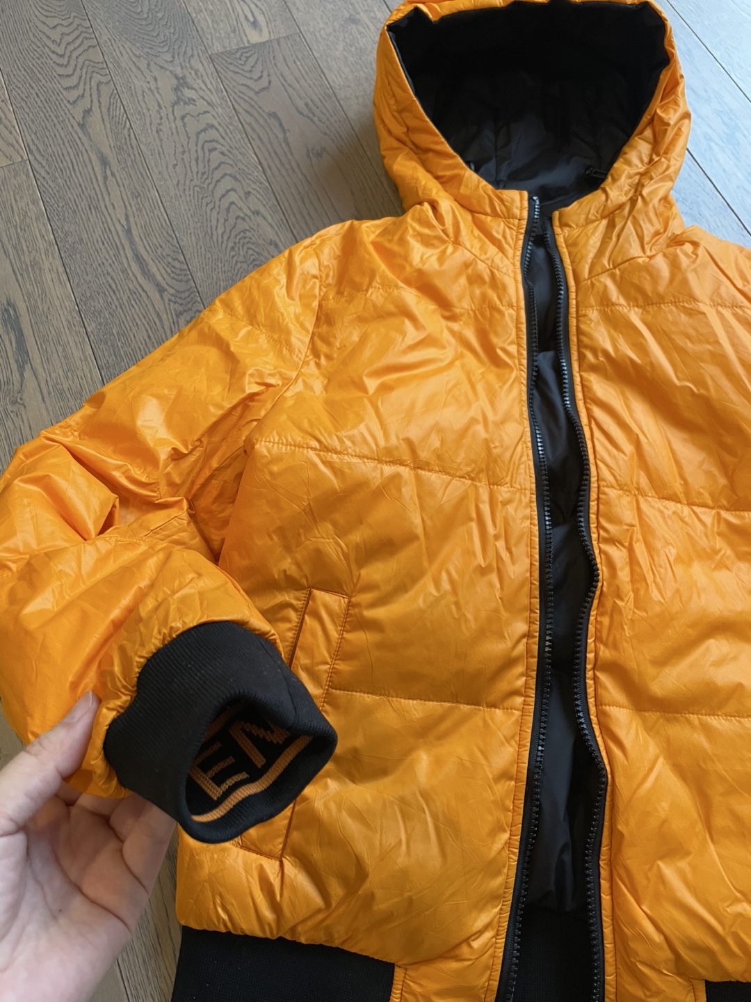 Reversible Black Puffer Jacket with Orange Lining