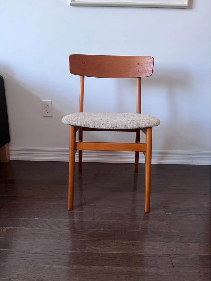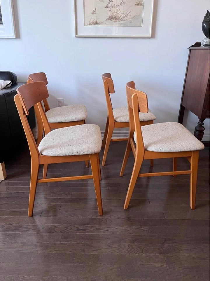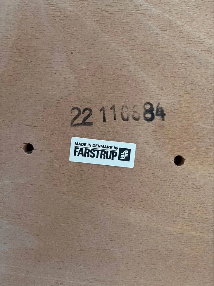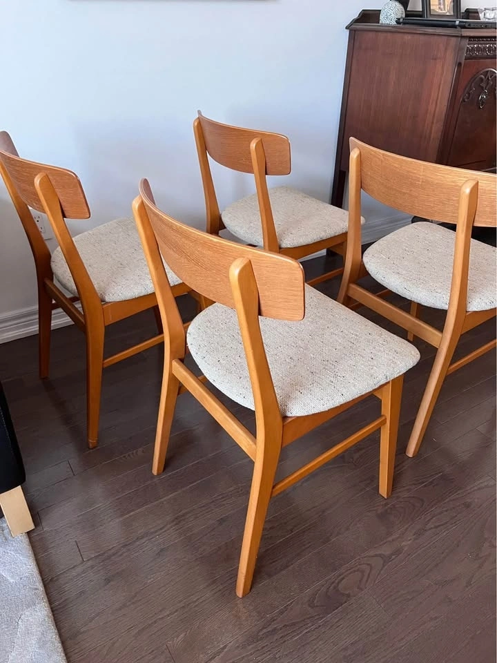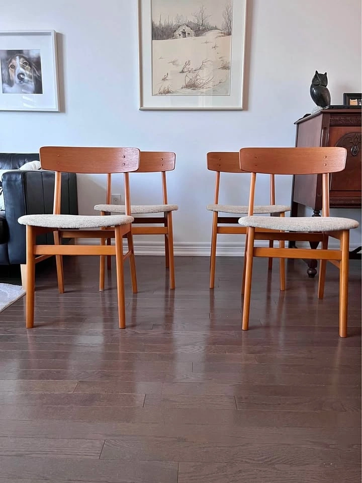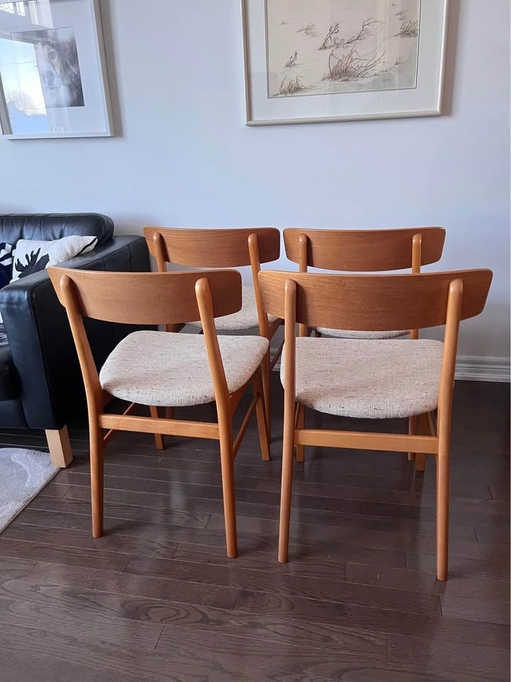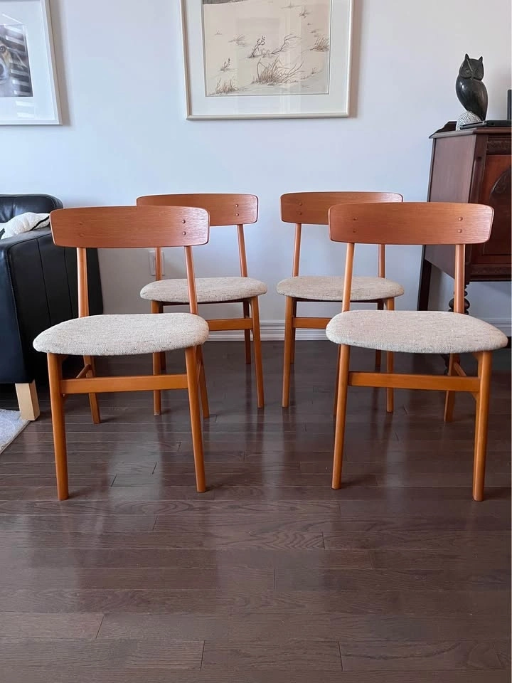 Vintage Danish Farstrup dining chairs, model 221. Wood is in excellent condition. No loose joints, all chairs are sturdy. Selling as a set of 4. Seat: 18"(H) x 18.5"(W) x 15"(D). Chair: 31"(H). I can offer free delivery in the Hamilton area if the distance is reasonable.