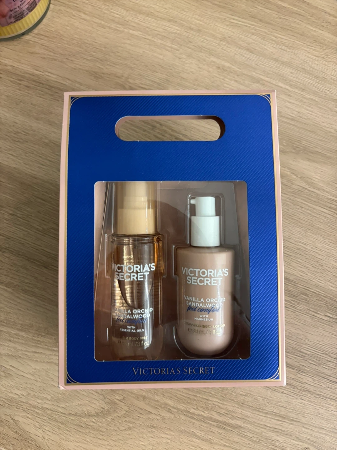 Victoria's Secret Vanilla Orchid Sandalwood fragrance mist and body lotion gift set. The mist is 75 mL and contains essential oils. The body lotion is 60 mL and formulated with magnesium.
