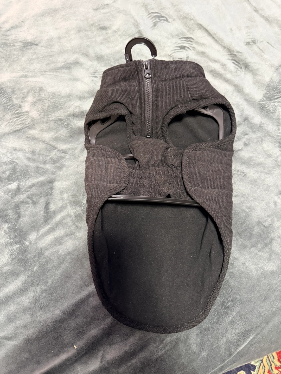 This black corduroy dog vest is perfect for keeping your furry friend warm. It features a zippered back for easy on and off. The elasticated waist ensures a snug fit. It's great for cooler weather walks!