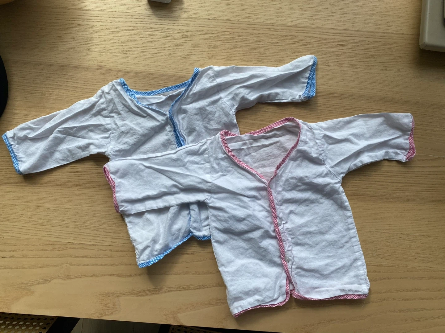 Two 5-9 kimonos in white cotton. One has pink trim and the other has blue trim. These are simple wrap-style shirts for infants.