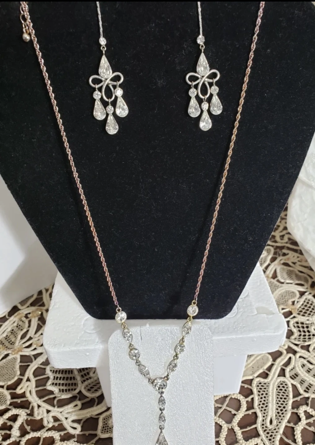A sparkly rhinestone necklace and matching dangle earrings. The set features a delicate chain and intricate stone detailing. It's perfect for adding a touch of glam to any outfit!