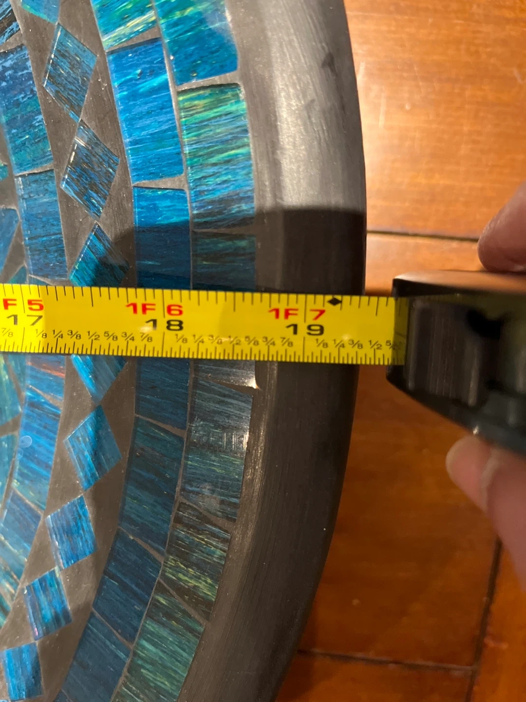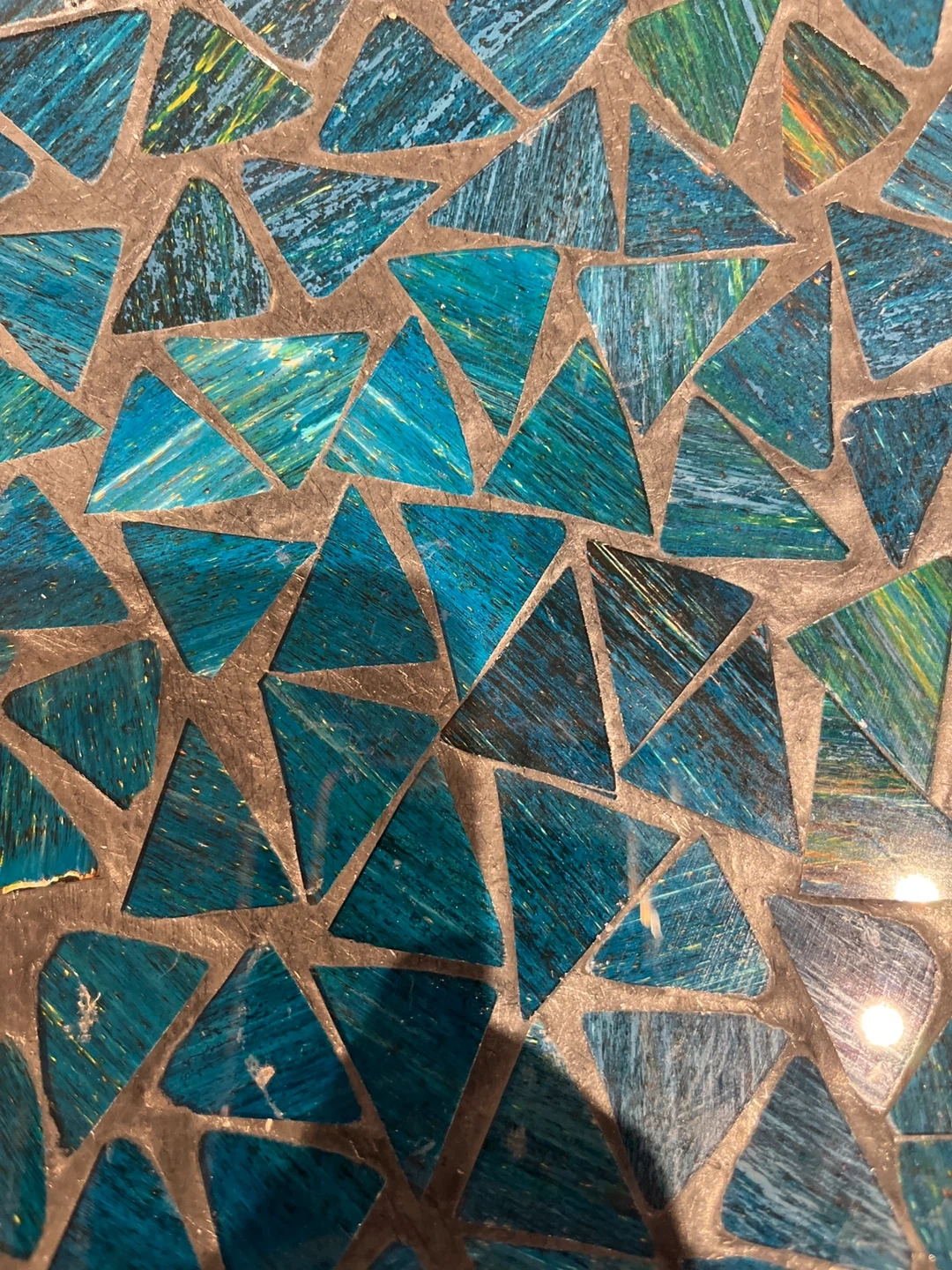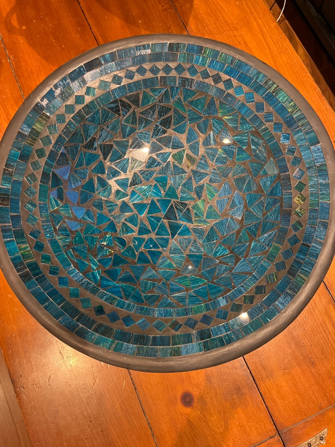 Selling a beautiful mosaic glass decorative plate. It features a stunning array of blue and green glass pieces arranged in a mosaic pattern. The plate measures approximately 19 inches in diameter, making it a great centrepiece or decorative accent for your home!