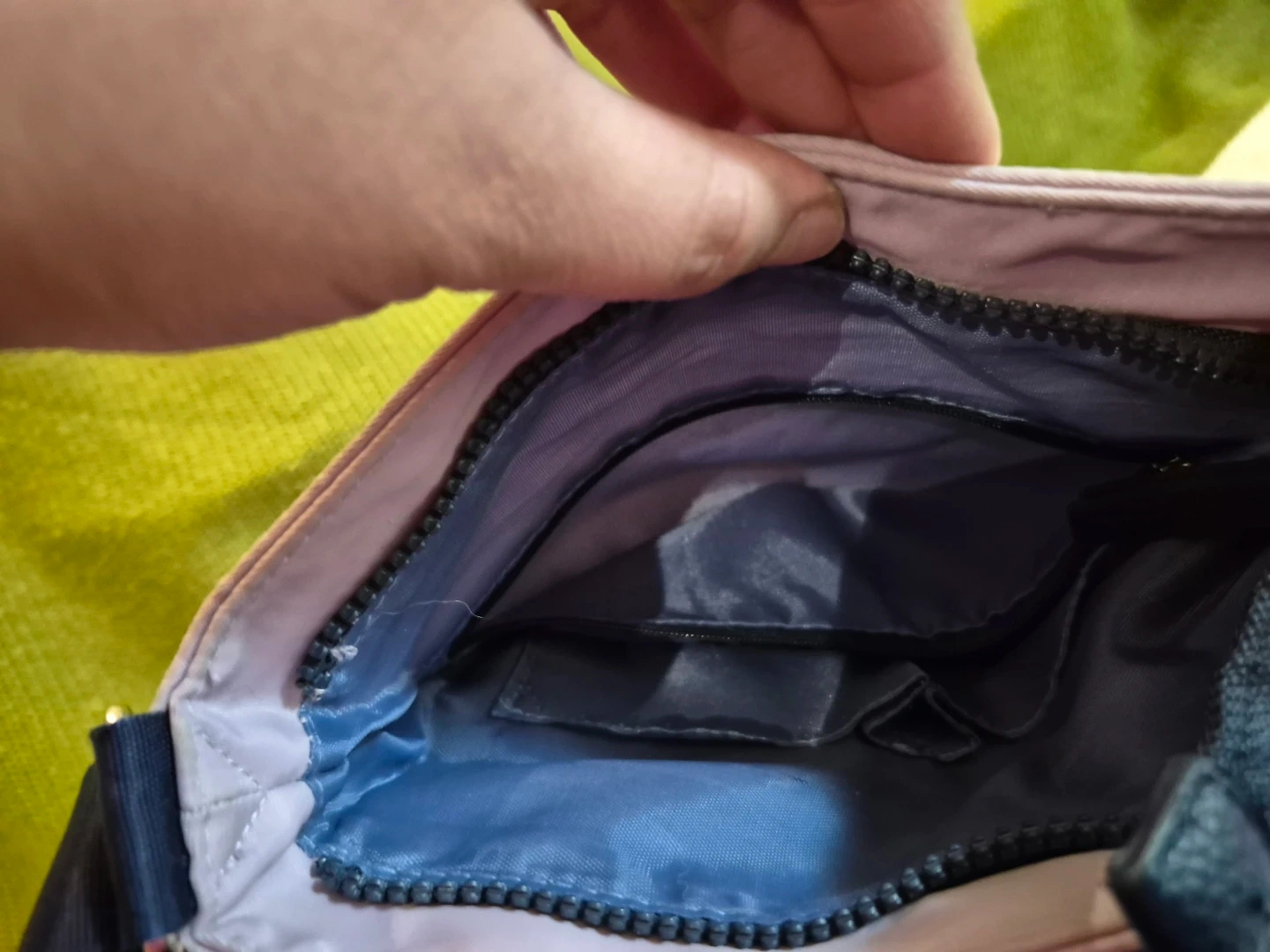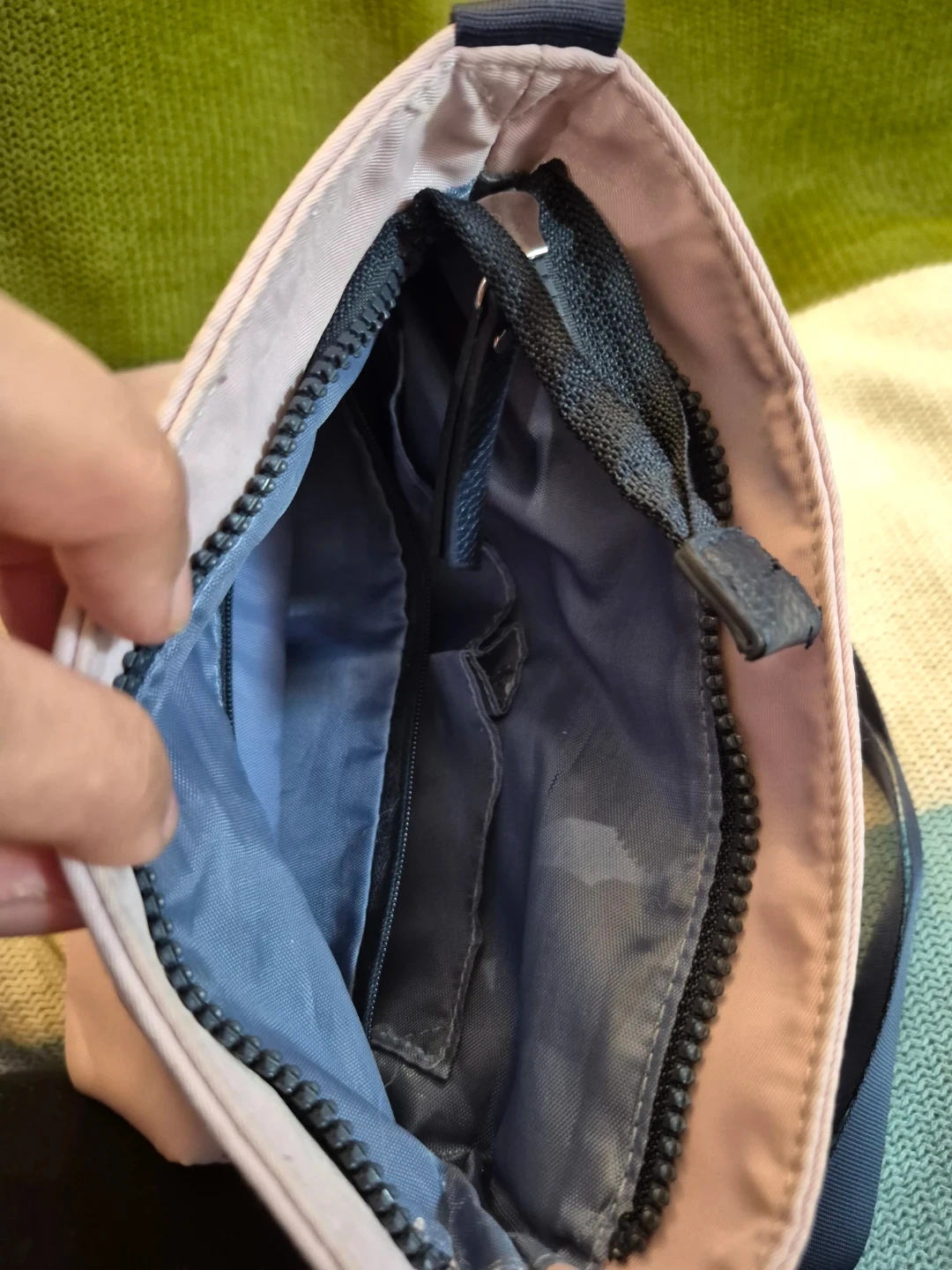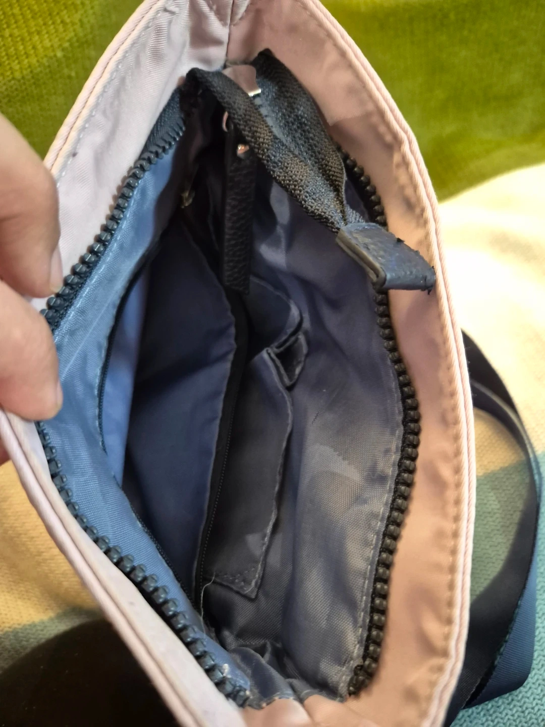 Light pink Nautica crossbody bag with a navy blue adjustable strap. It's made of nylon and has multiple interior pockets. The strap has "NAUTICA" printed on it.