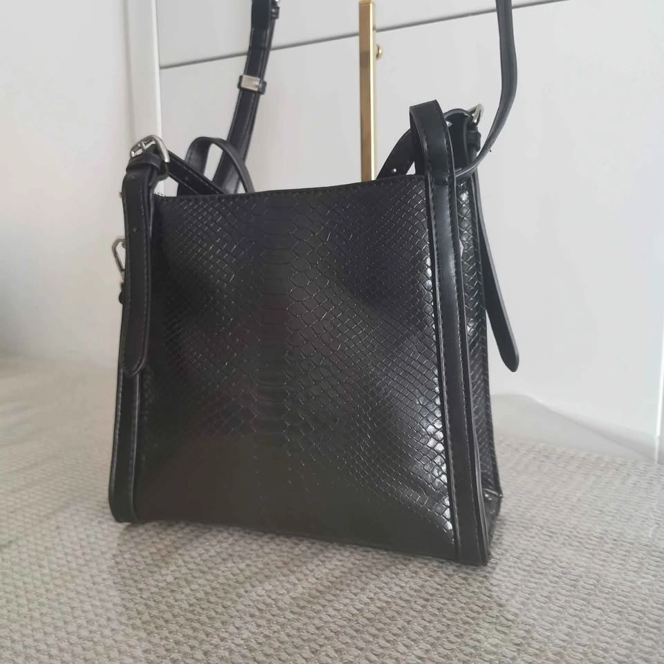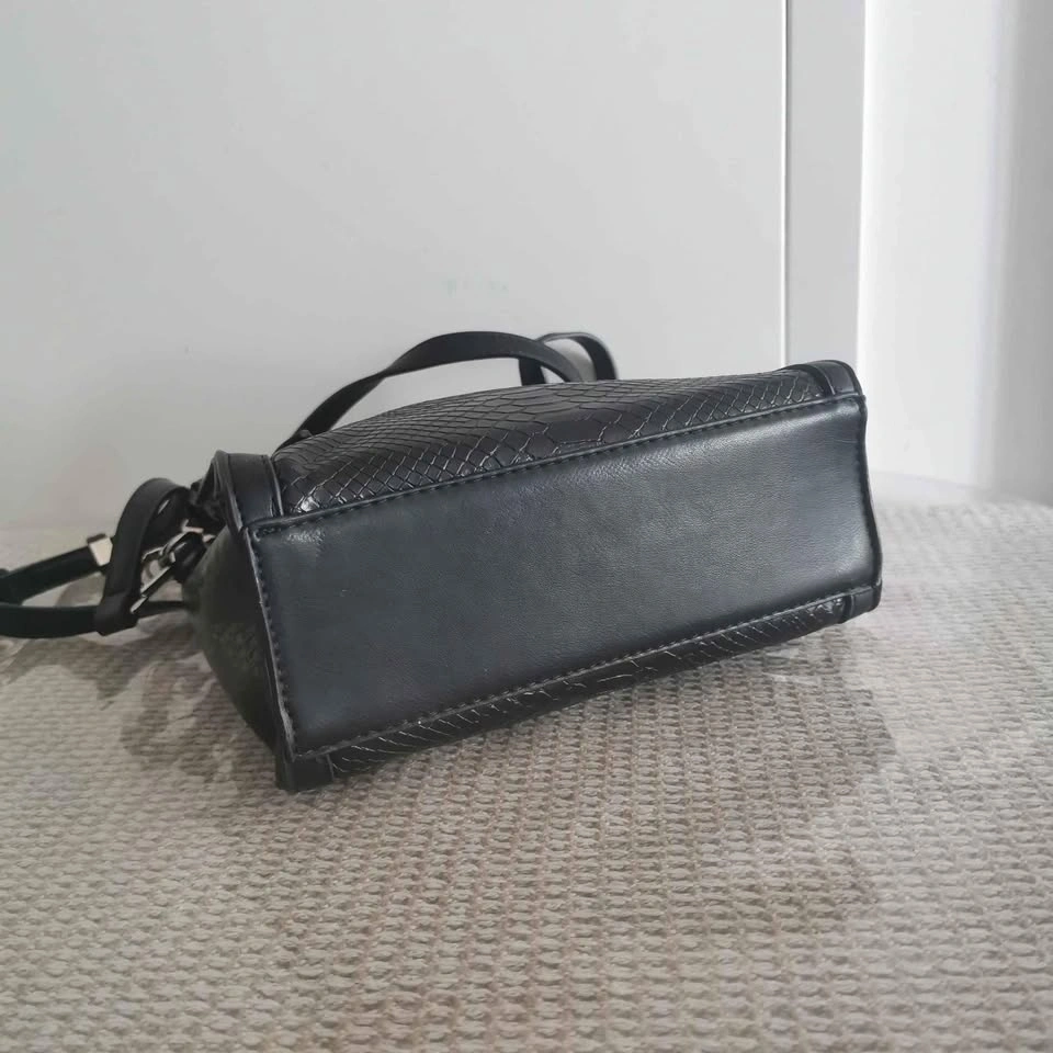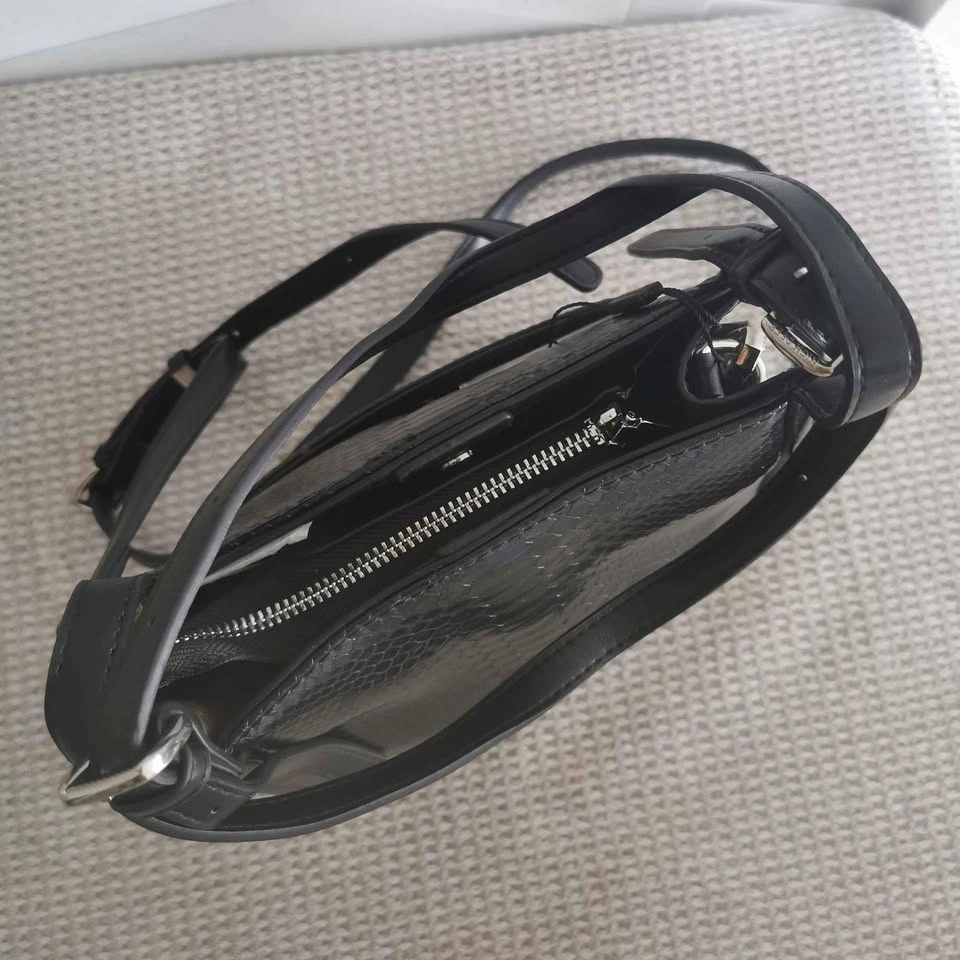 High Deer black leather shoulder bag with a snakeskin pattern. Features an adjustable strap. Size: (L*H*W): 8.5*8*3 inch. Located near Dundas St Downtown Toronto.