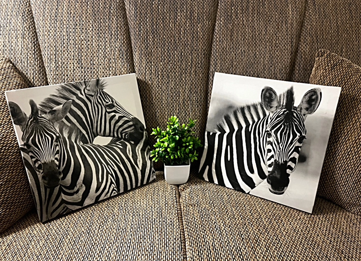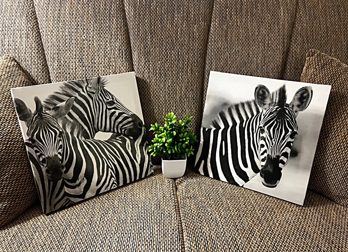 Four black and white canvas paintings featuring zebra images. In great condition, perfect for any room in your house! They are beautiful, I just don’t have the room to put them up in inside my home.