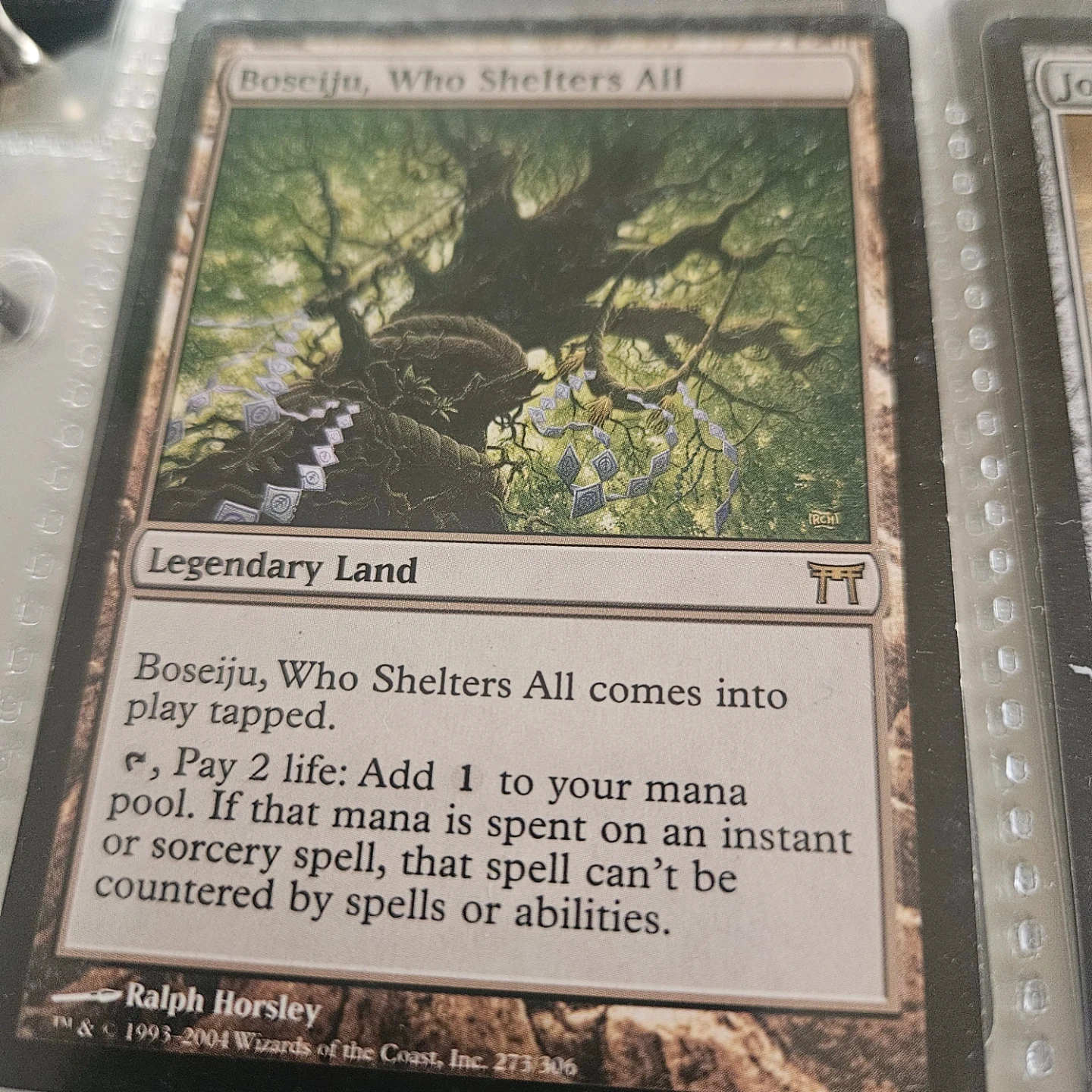 Selling the card 'Boseiju, Who Shelters All' from Magic: The Gathering. It's a legendary land card. Comes into play tapped. Add 1 to your mana pool. If that mana is spent on an instant or sorcery spell, that spell can't be countered by spells or abilities. Illustrated by Ralph Horsley.