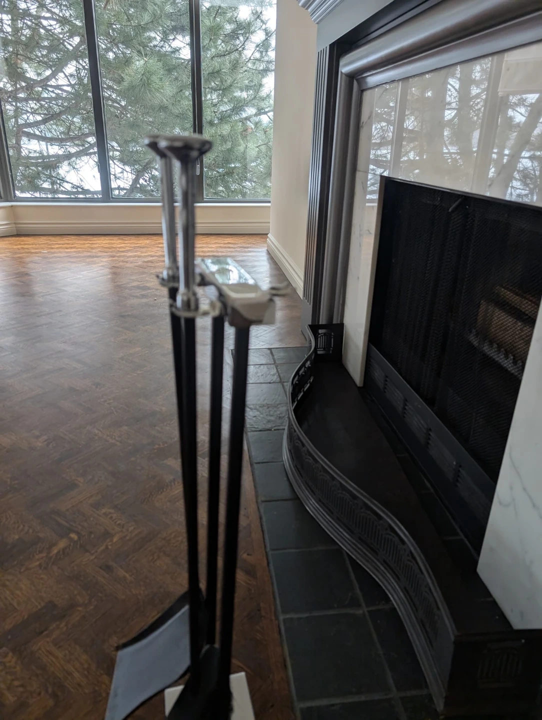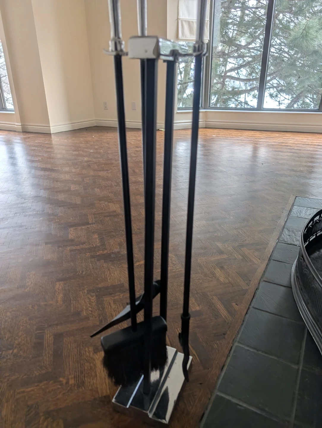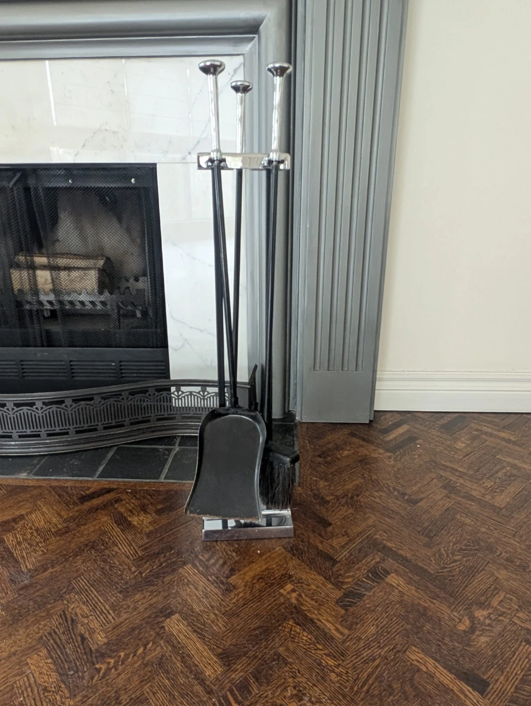 This fireplace tool set includes a shovel, brush, and poker. It's made of metal with a chrome accent. Keep your hearth tidy!