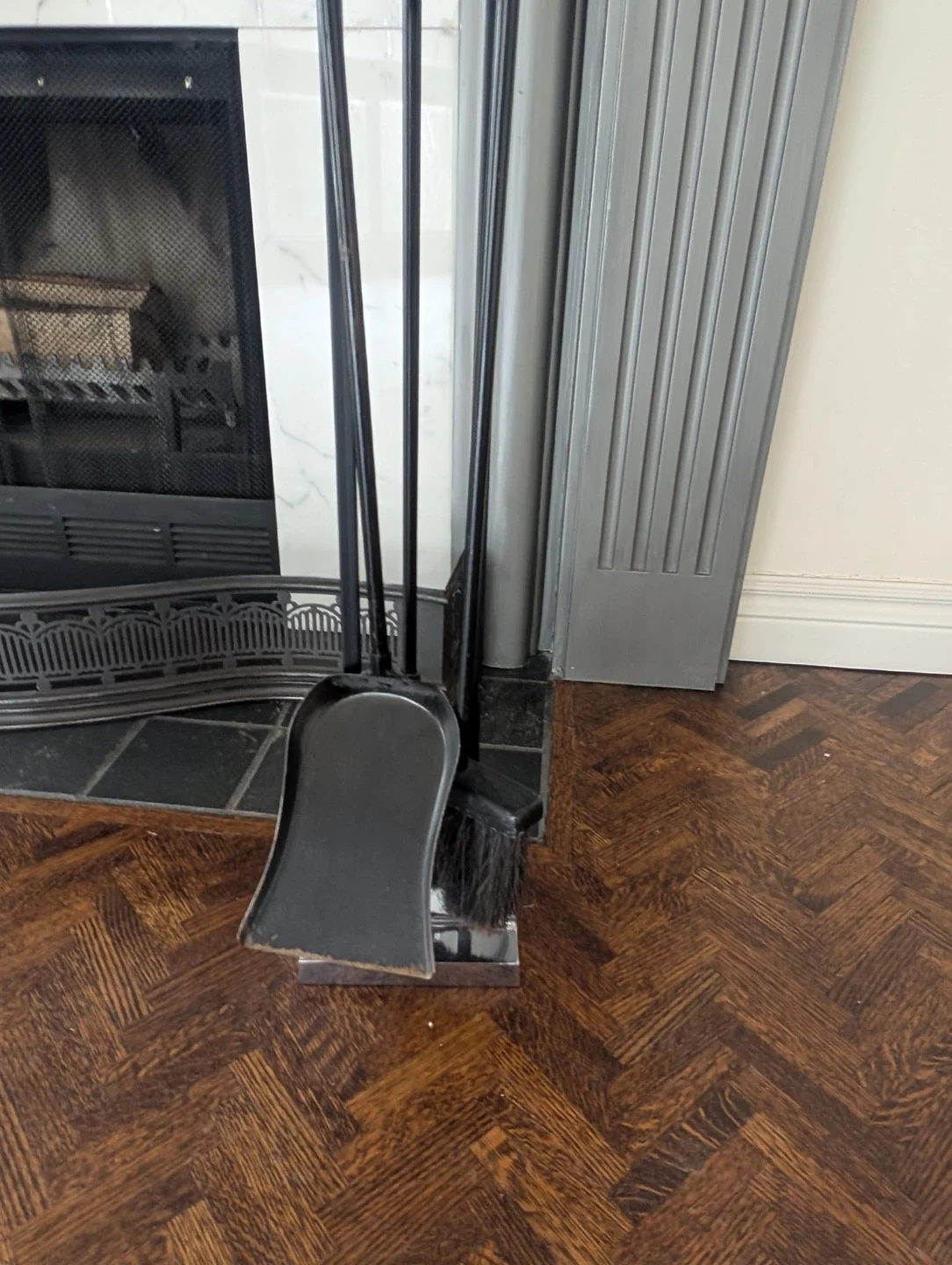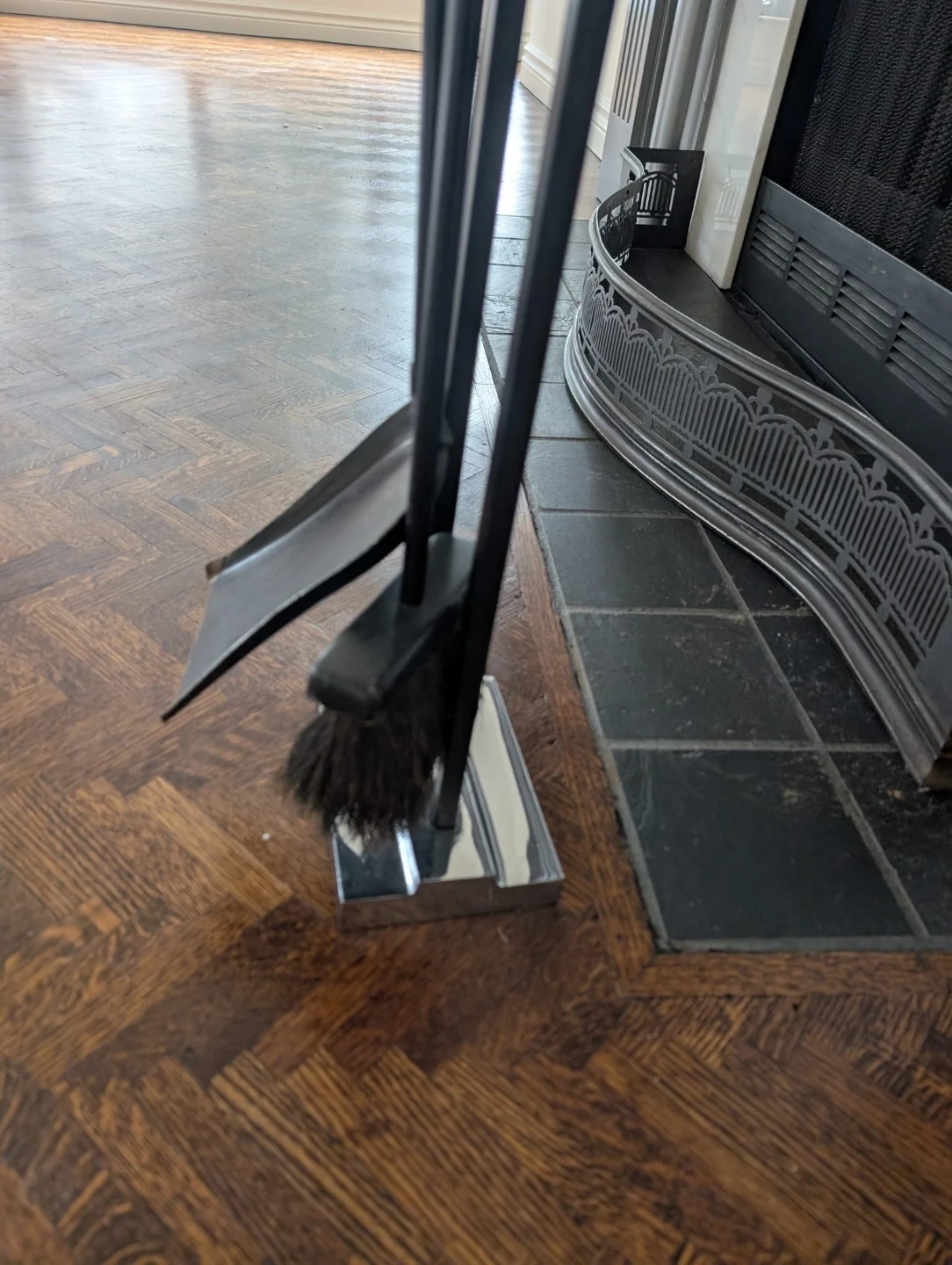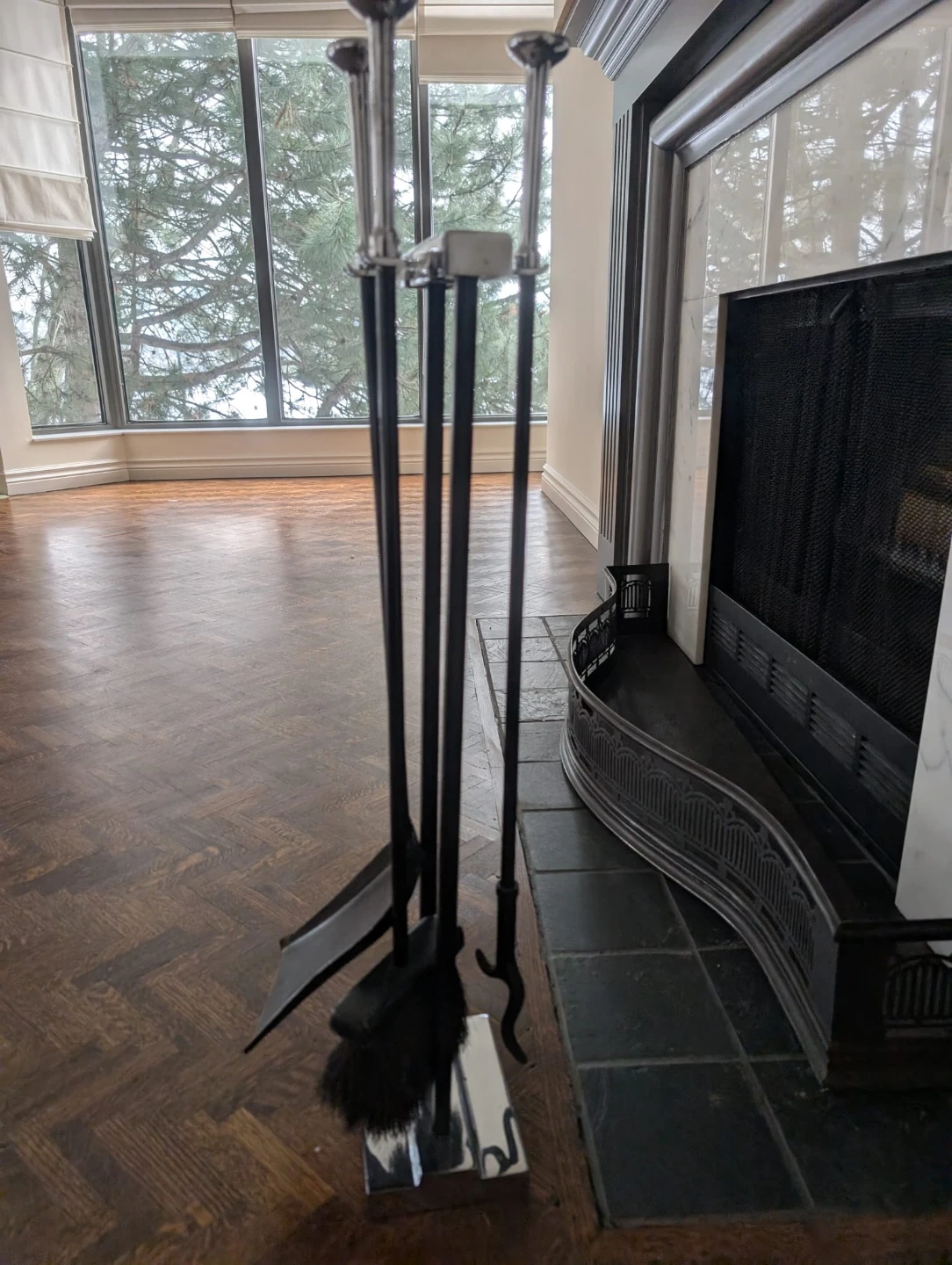 This fireplace tool set includes a shovel, brush, and poker. It's made of metal with a chrome accent. Keep your hearth tidy!