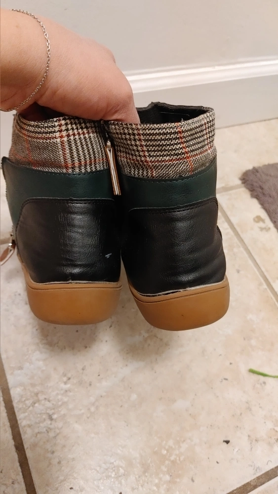 They feature a side zipper for easy on and off. The soles are a light brown rubber.