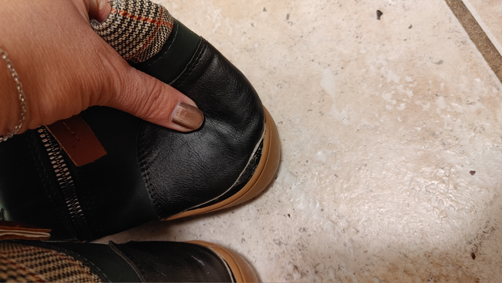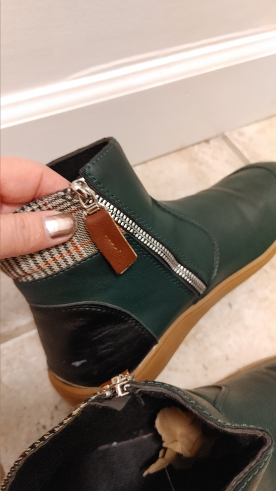 They feature a side zipper for easy on and off. The soles are a light brown rubber.