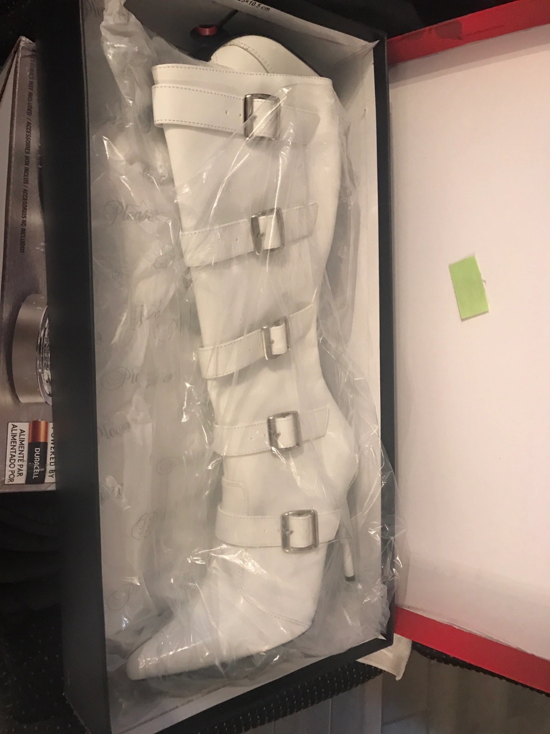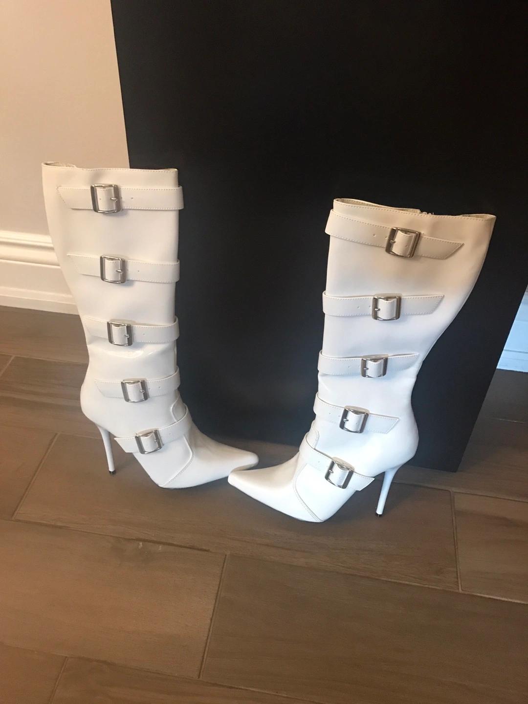 White leather-look knee-high boots. Multiple buckles. Stiletto heel. Size 8M. New in box.
