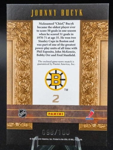 This is a 2010-2011 Panini Crown Royale Johnny Bucyk Jersey Card, numbered 098/100. The card is protected in a penny sleeve and top-loader. Let me know if you're interested!