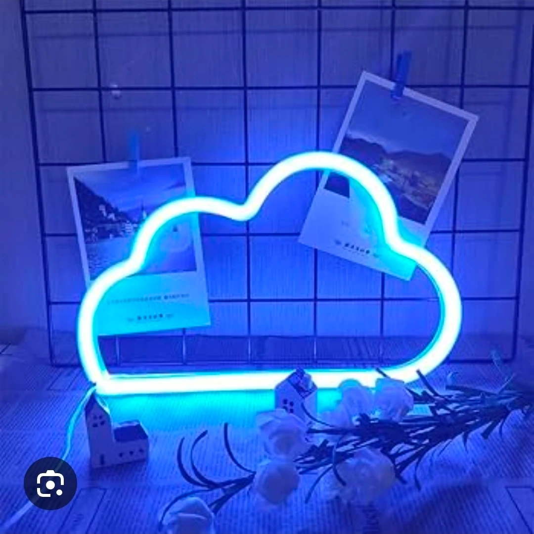This is a blue cloud-shaped neon sign. It's powered by USB cord ( plug into wall or usb)